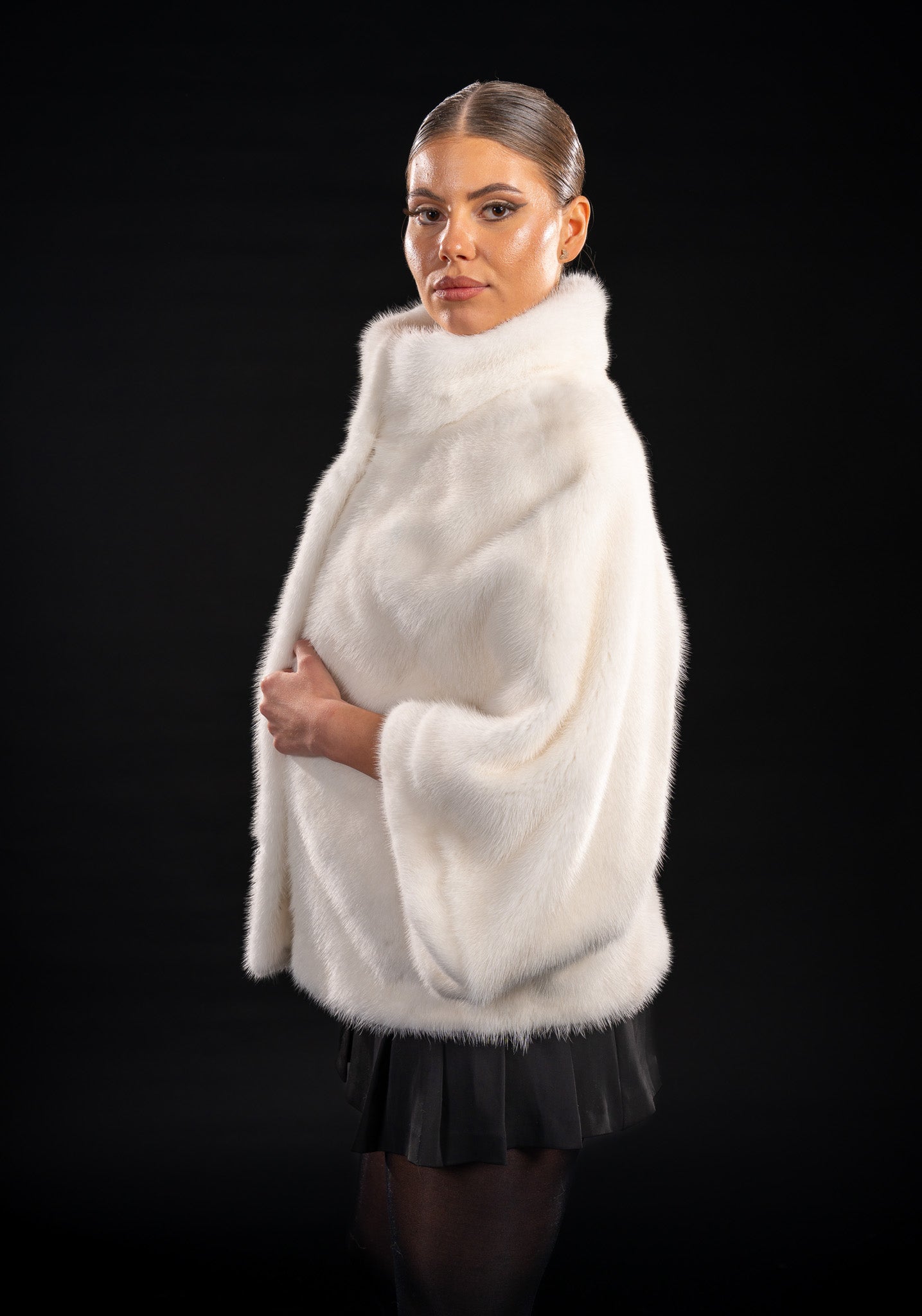 Delicatețe și eleganță desăvârșită într-o singură piesă – această capă din blană naturală de vizon, într-o nuanță pură și luminoasă de alb, îmbină stilul clasic cu o notă contemporană de finețe. Croiala tip capă, cu mâneci trei sferturi și o lungime de 60 cm, oferă libertate de mișcare și confort, păstrând o linie feminină, grațioasă și sofisticată.
