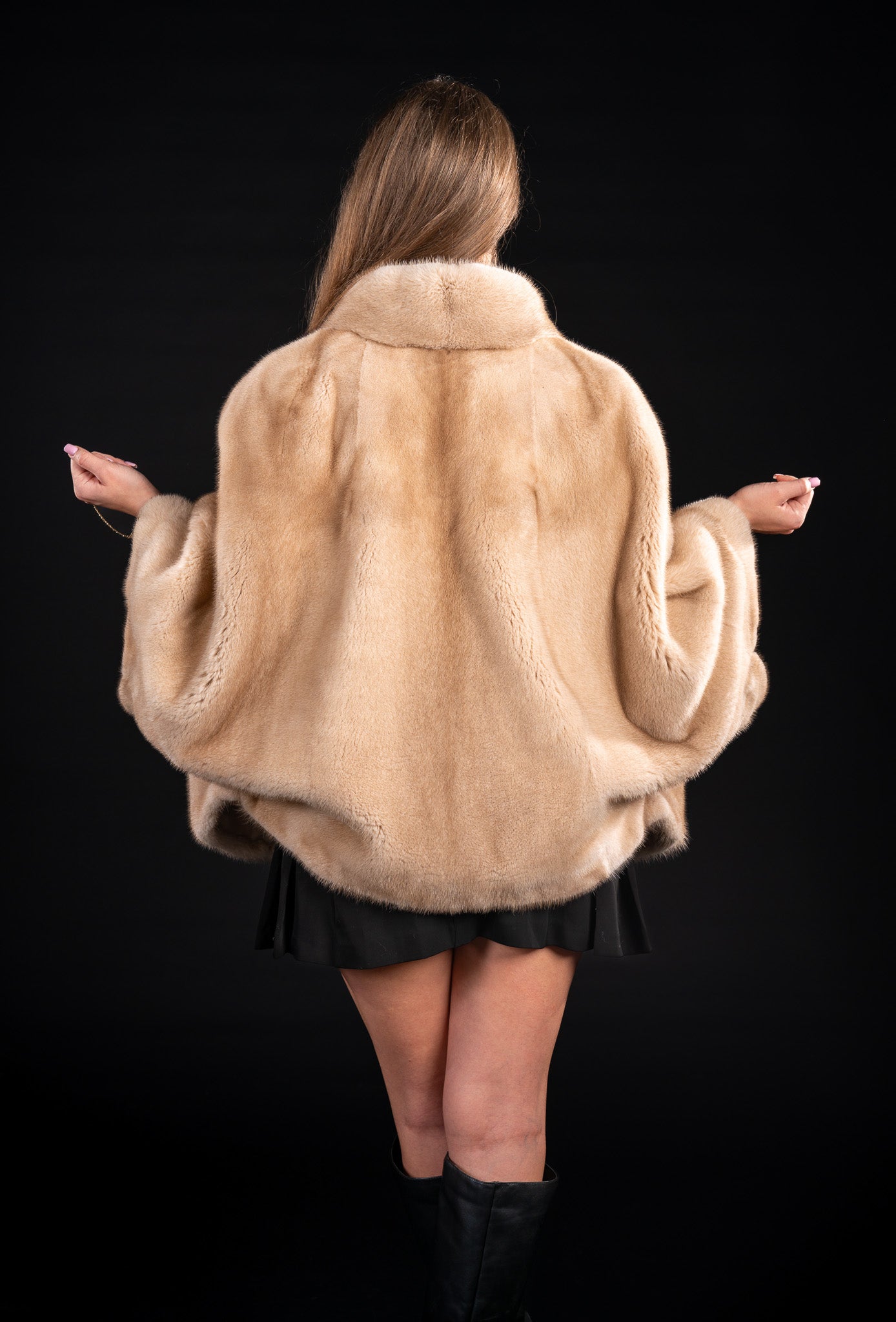 Rafinament și lux într-o singură piesă – această capă din blană naturală de vizon, într-o nuanță caldă și sofisticată Light Pastel, combină eleganța clasică cu funcționalitatea modernă. Croiala tip capă, cu mâneci trei sferturi, oferă libertate de mișcare și confort, păstrând totodată un aspect impecabil și sofisticat.