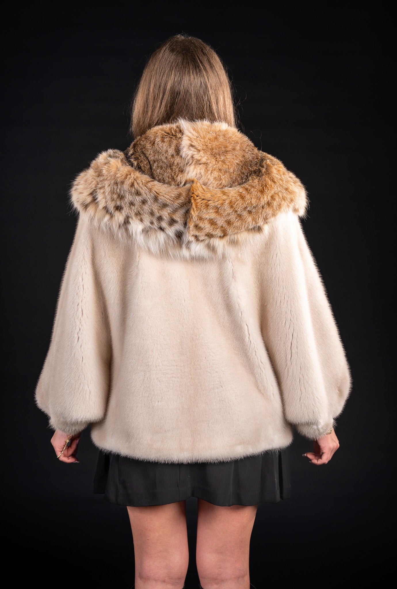 CAPA DIN BLANA NATURALA DE VIZON PERLA , CU GLUGA DIN BLANA DE LYNX