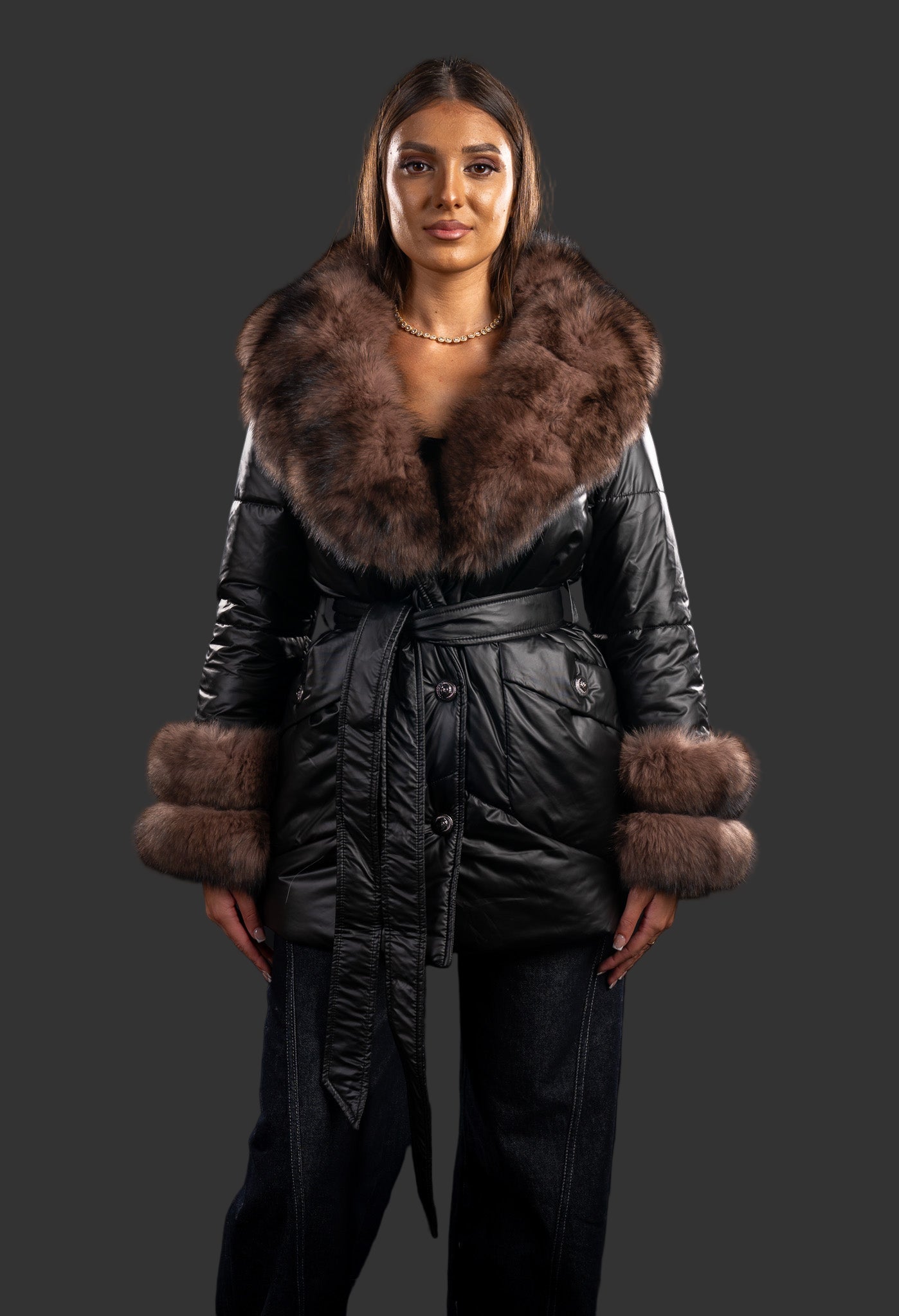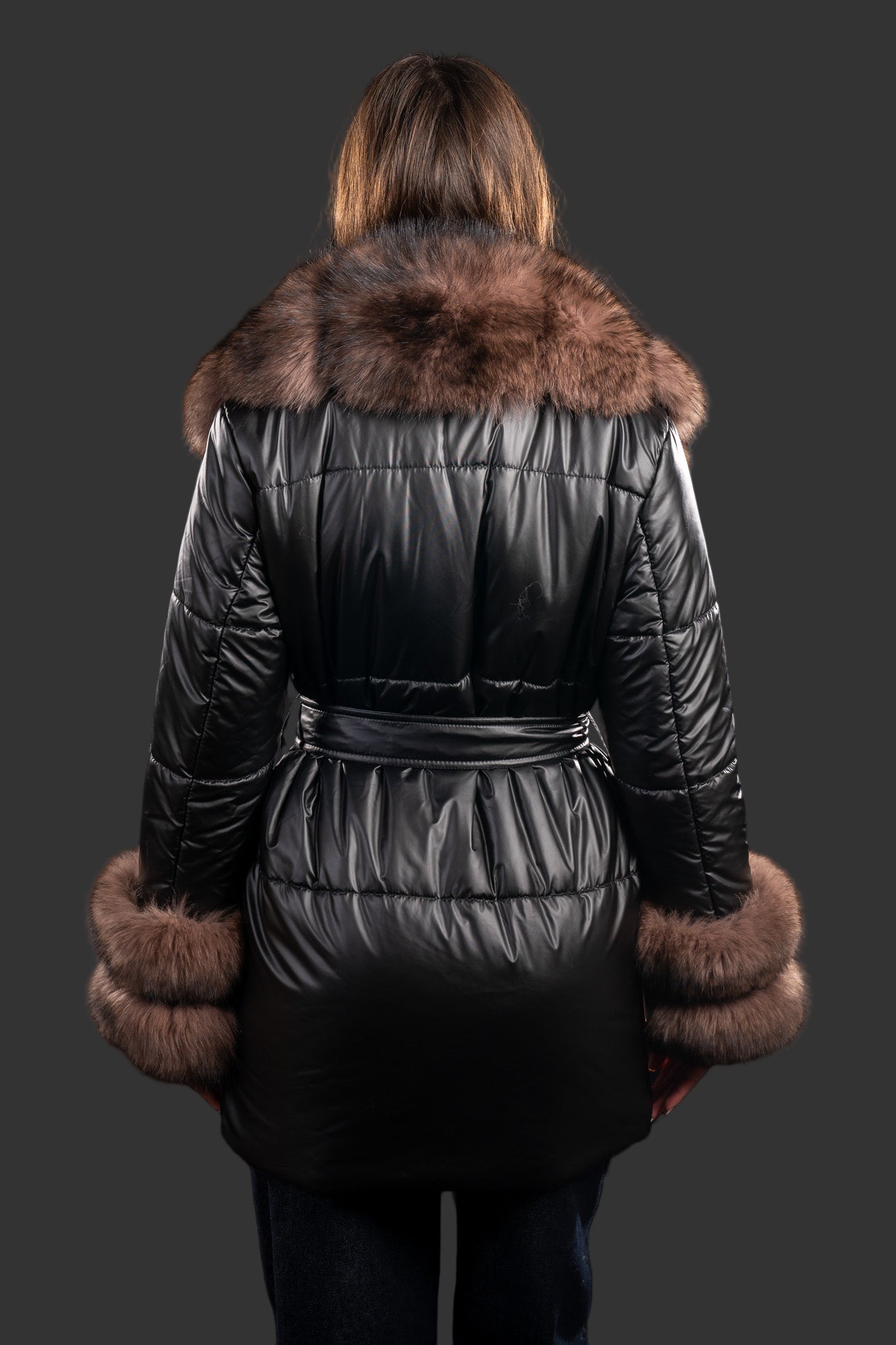 Gulerul amplă, prevăzut cu blană naturală de vulpe polară, oferă volum și o notă luxoasă, protejând eficient împotriva frigului. Manșetele oferă o continuitate ce scoate în evidență piesa vestimentară, având 2 rânduri generoase de vulpe. Blana este detașabilă, permițând adaptarea piesei în funcție de stil sau sezon. Materialul exterior din fâș lucios este rezistent la vânt și umezeală, menținând un aspect elegant chiar și în cele mai reci zile.