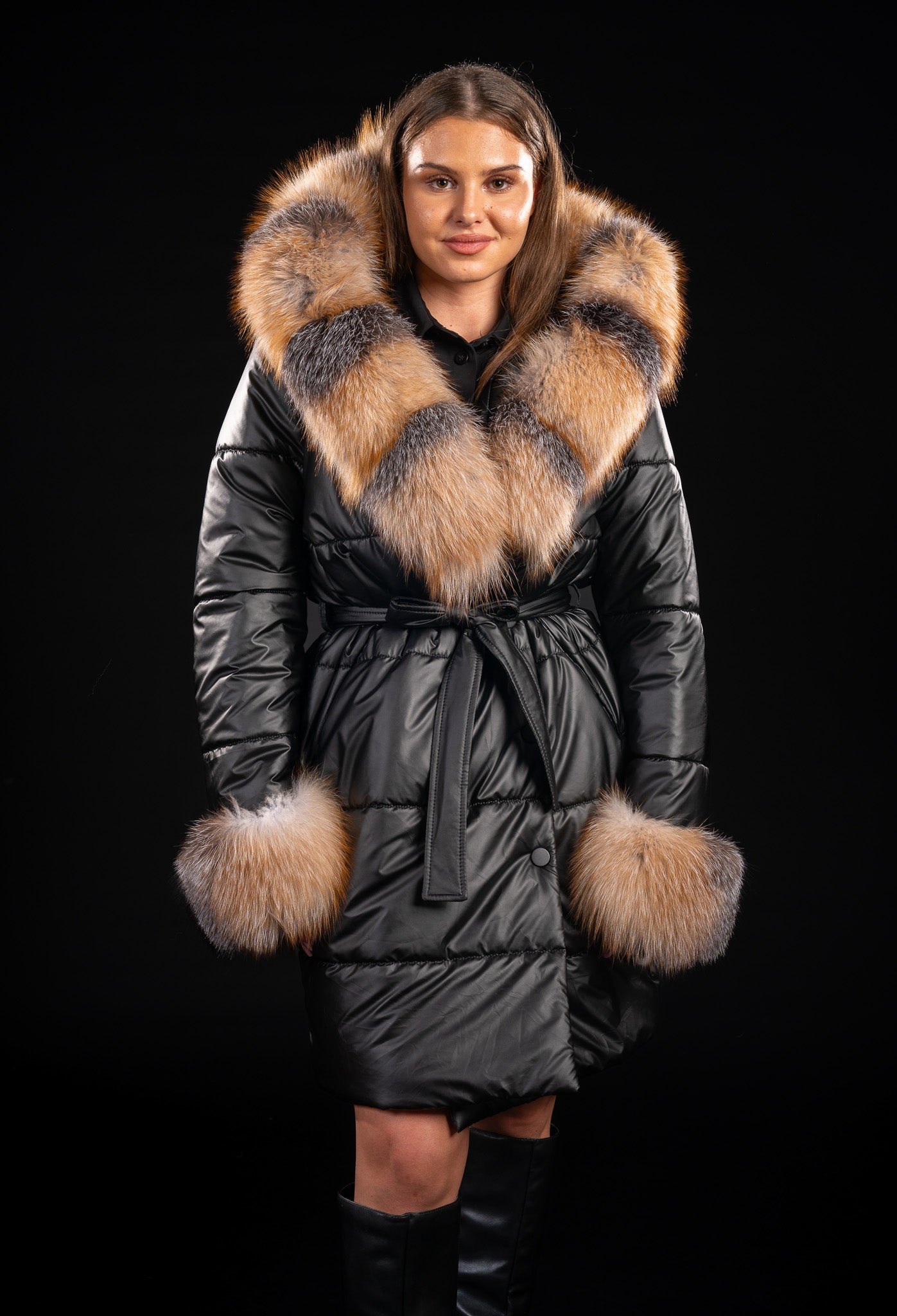 Gluga amplă, prevăzut cu blană naturală de vulpe canadiana , oferă volum și o notă luxoasă, protejând eficient împotriva frigului. Manșetele oferă o continuitate ce scoate în evidență piesa vestimentară, având 2 rânduri generoase de vulpe. Blana este detașabilă, permițând adaptarea piesei în funcție de stil sau sezon. Materialul exterior din fâș lucios este rezistent la vânt și umezeală, menținând un aspect elegant chiar și în cele mai reci zile.