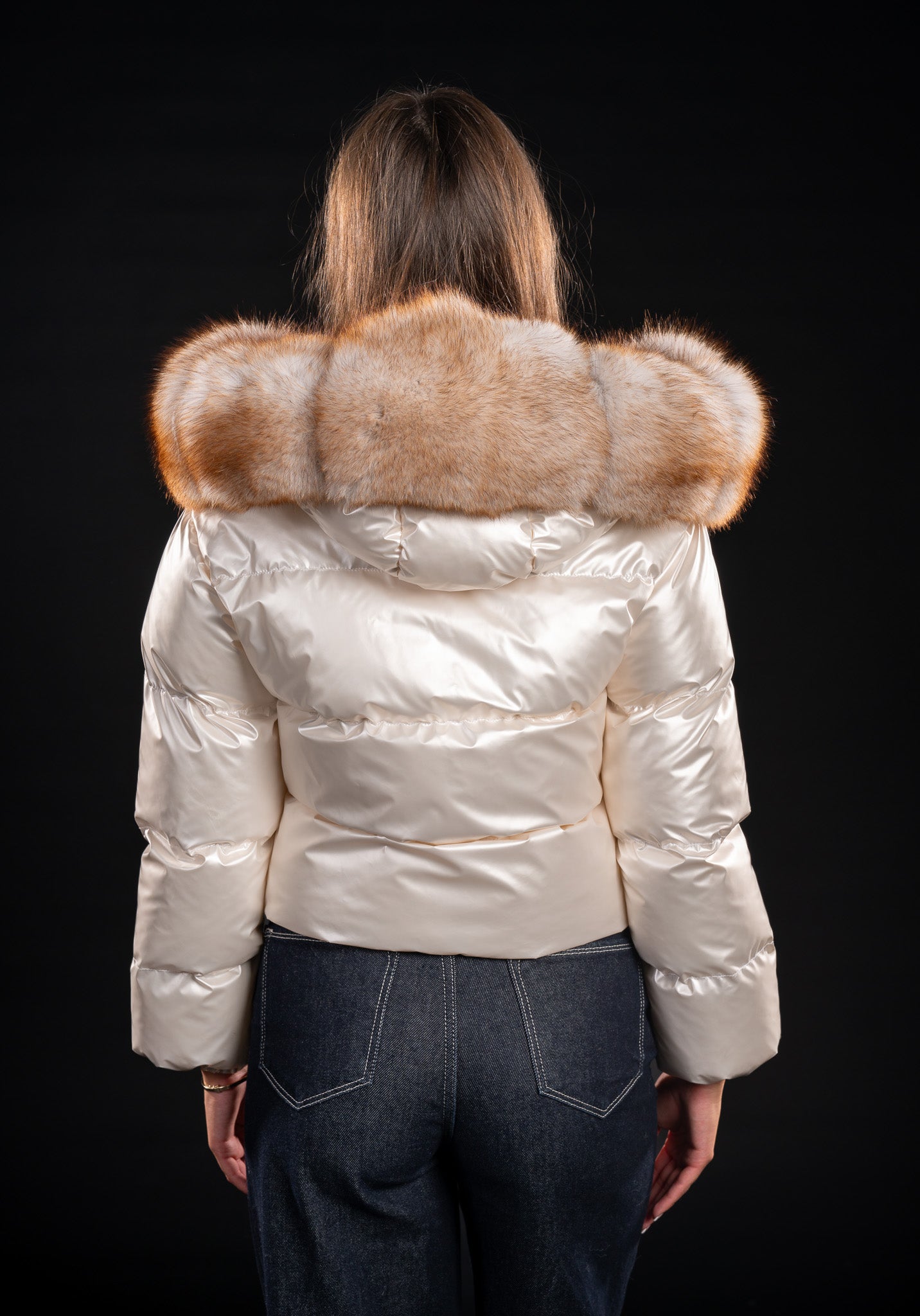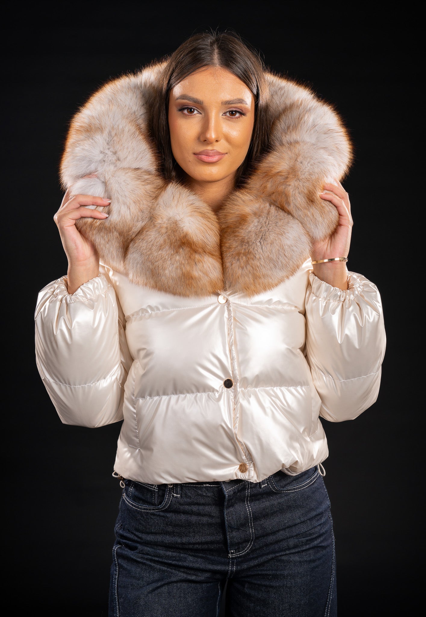 Geacă scurtă de fâș cu glugă și blană naturală de vulpe, creată pentru femeia care apreciază echilibrul perfect între rafinament și confort. Modelul se remarcă prin nuanța sa delicată de ivoar sidefat, un ton luminos ce adaugă eleganță oricărei ținute, păstrând în același timp un aer modern și sofisticat.