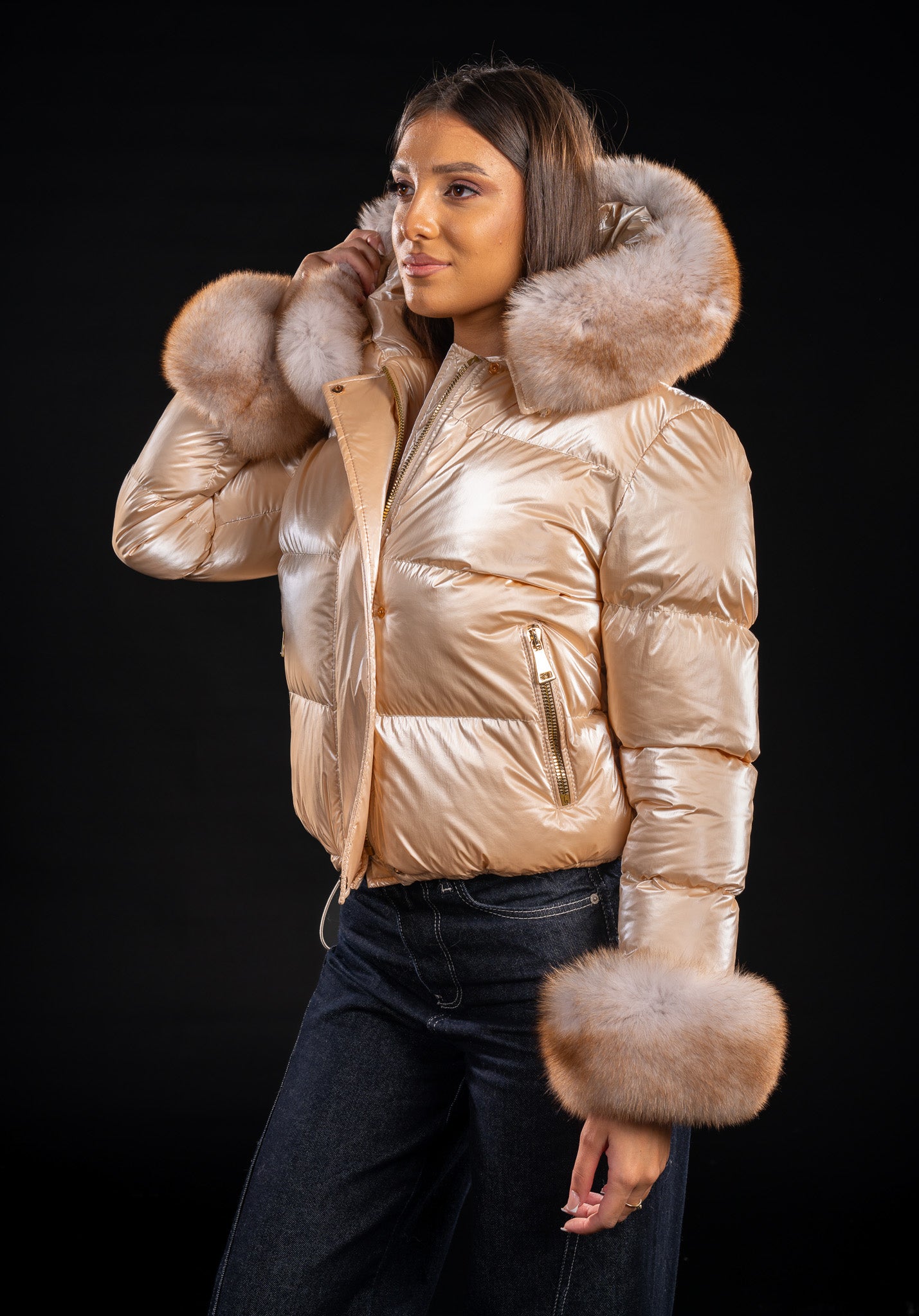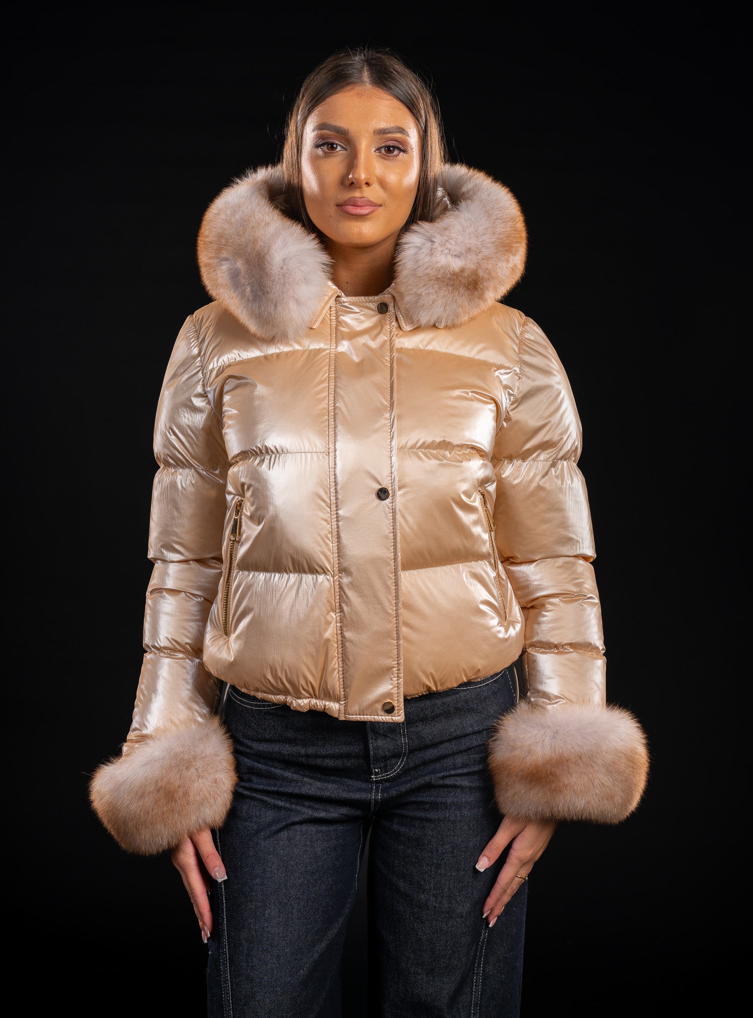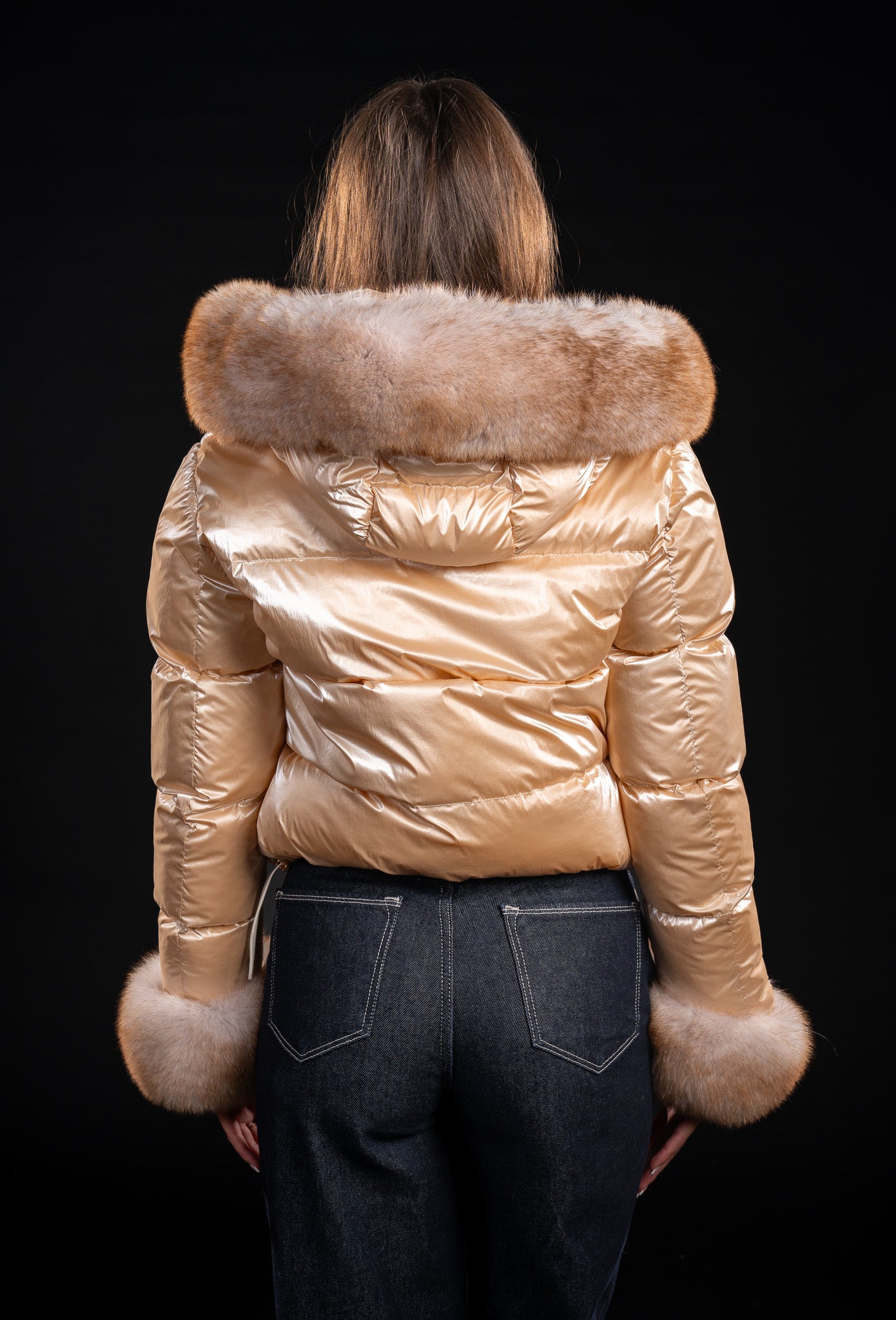 Geacă scurtă de fâș cu glugă și blană naturală de vulpe polară, creată pentru femeia care apreciază echilibrul perfect între rafinament și confort. Modelul se remarcă prin nuanța sa delicată de auriu sidefat, un ton luminos ce adaugă eleganță oricărei ținute, păstrând în același timp un aer modern și sofisticat.