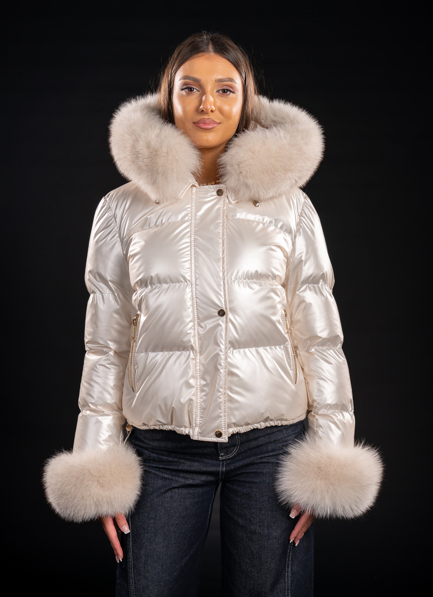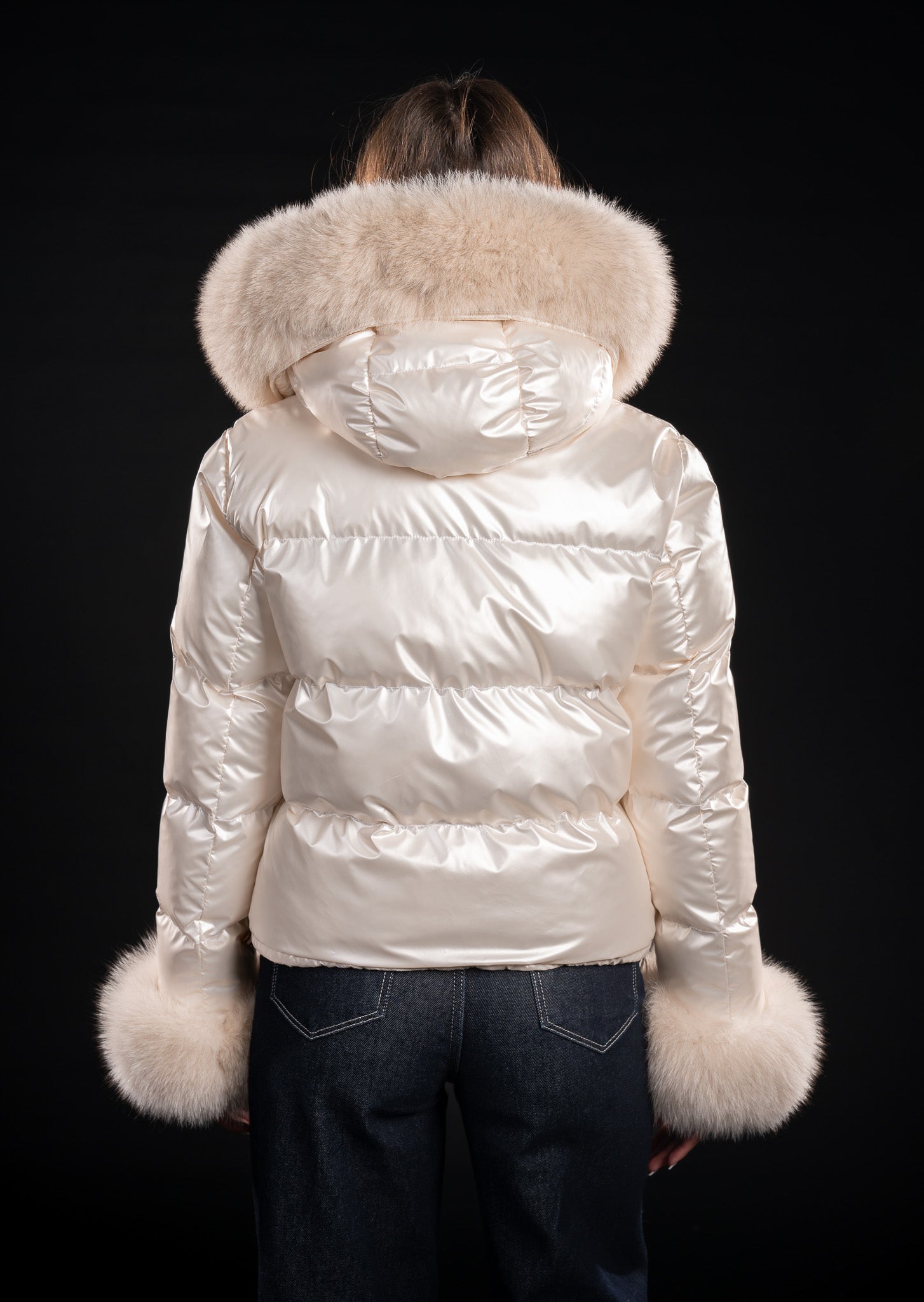 Geacă scurtă de fâș cu glugă și blană naturală de vulpe, creată pentru femeia care apreciază echilibrul perfect între rafinament și confort. Modelul se remarcă prin nuanța sa delicată de ivoar sidefat, un ton luminos ce adaugă eleganță oricărei ținute, păstrând în același timp un aer modern și sofisticat.