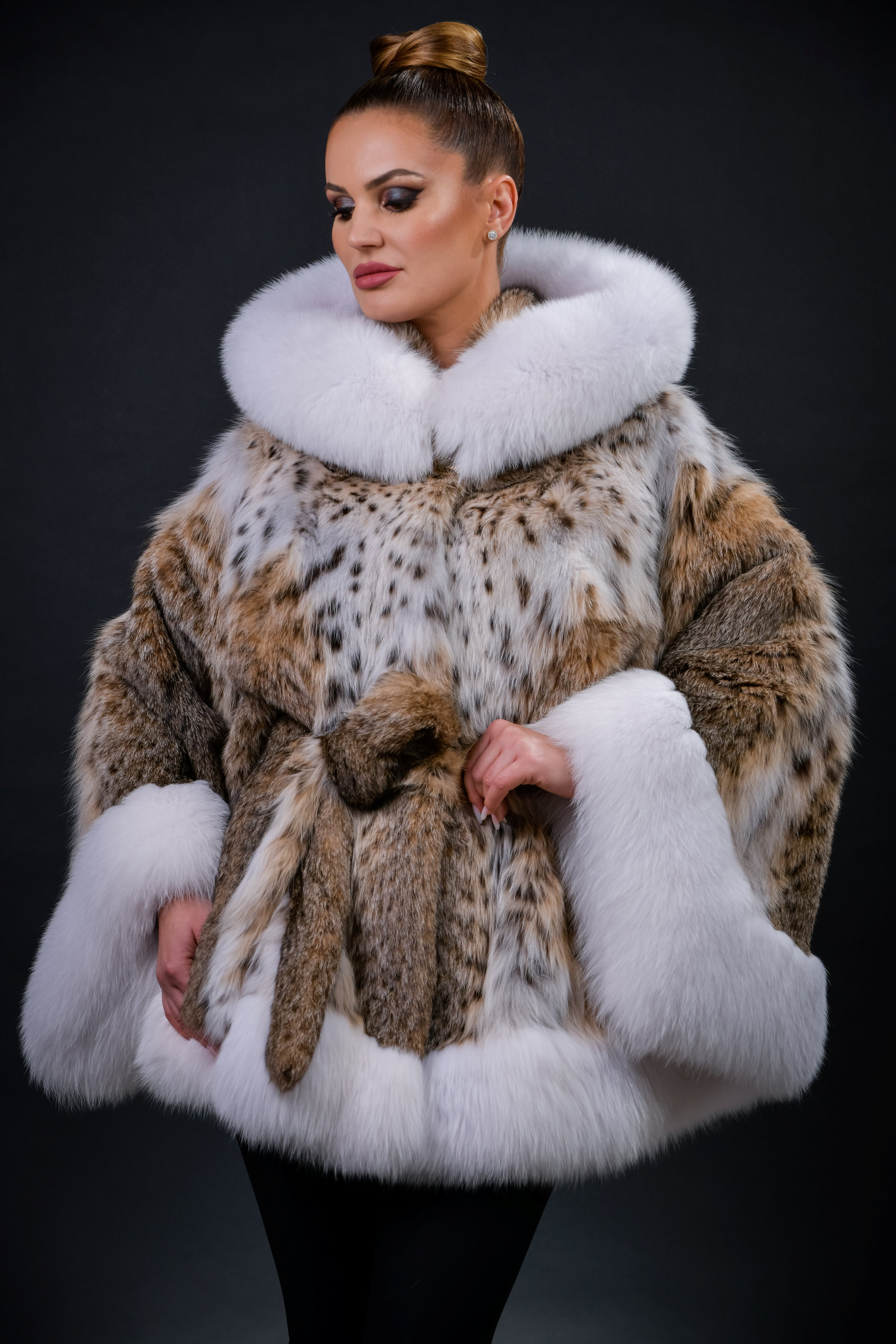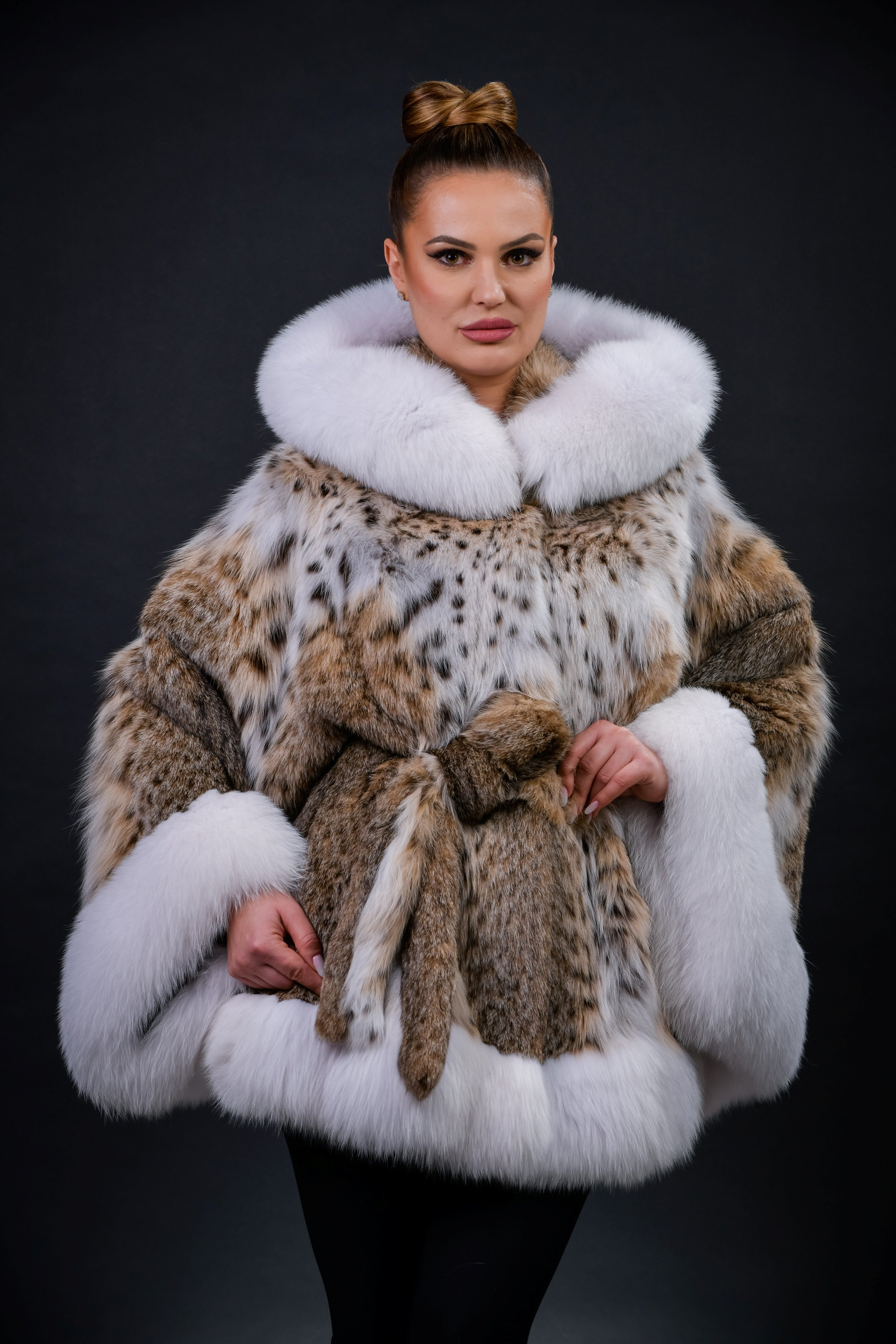 Rafinament, eleganță și exclusivitate definesc acest model spectaculos „Fluture”, realizat din blană naturală de Lynx de cea mai înaltă calitate. Croiul amplu, cu linii fluide și armonioase, este pus în valoare de cordonul delicat în talie, care subliniază silueta într-un mod subtil și feminin.