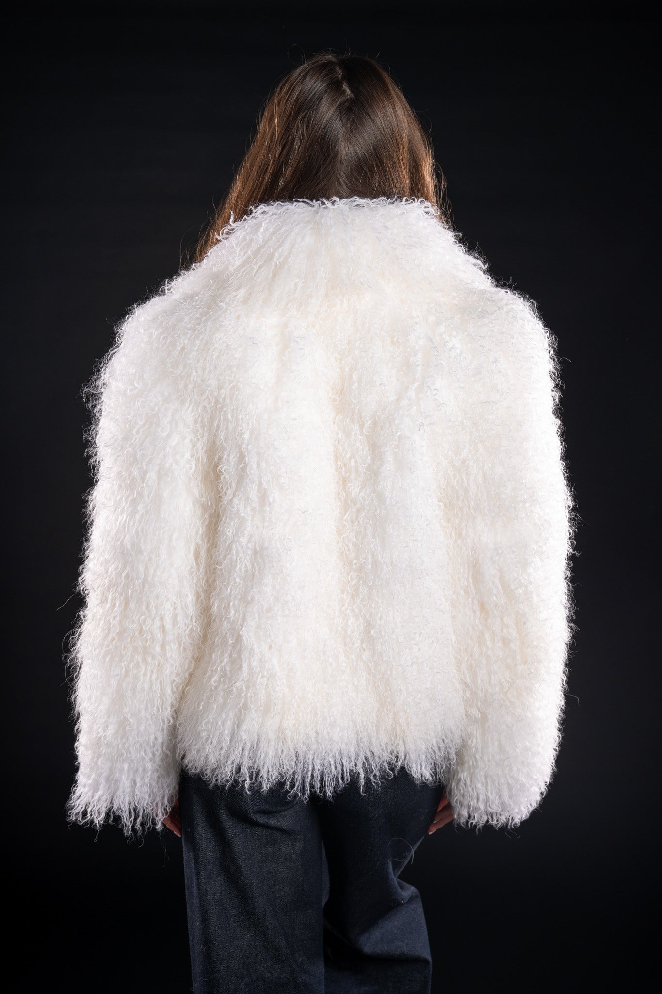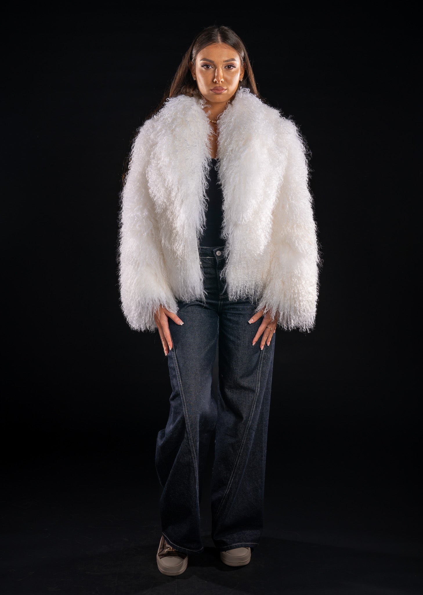 Această haină elegantă este confecționată din blană naturală de miel tibetan, de culoare alb imaculat, oferind un aspect sofisticat și luxos.