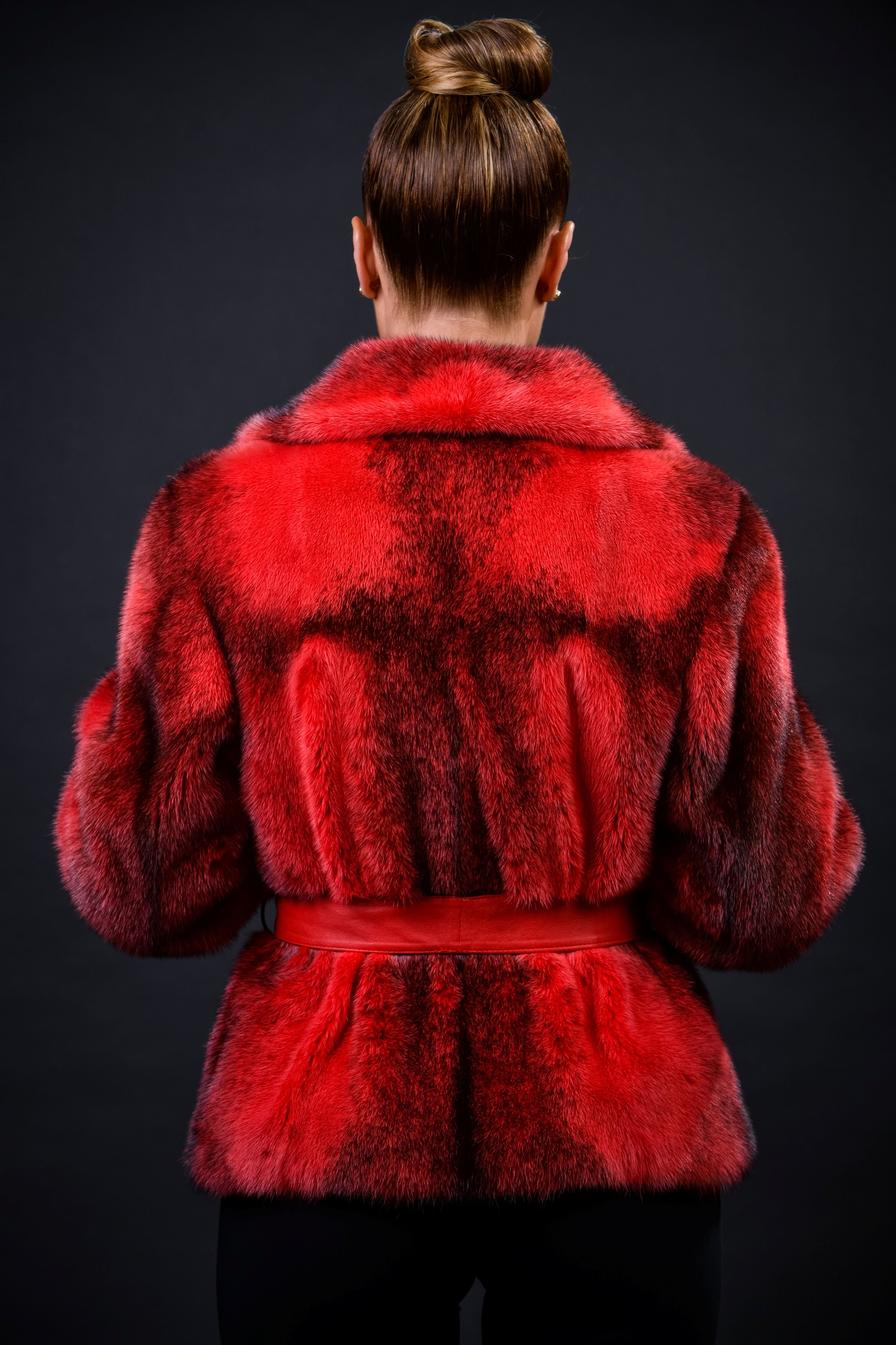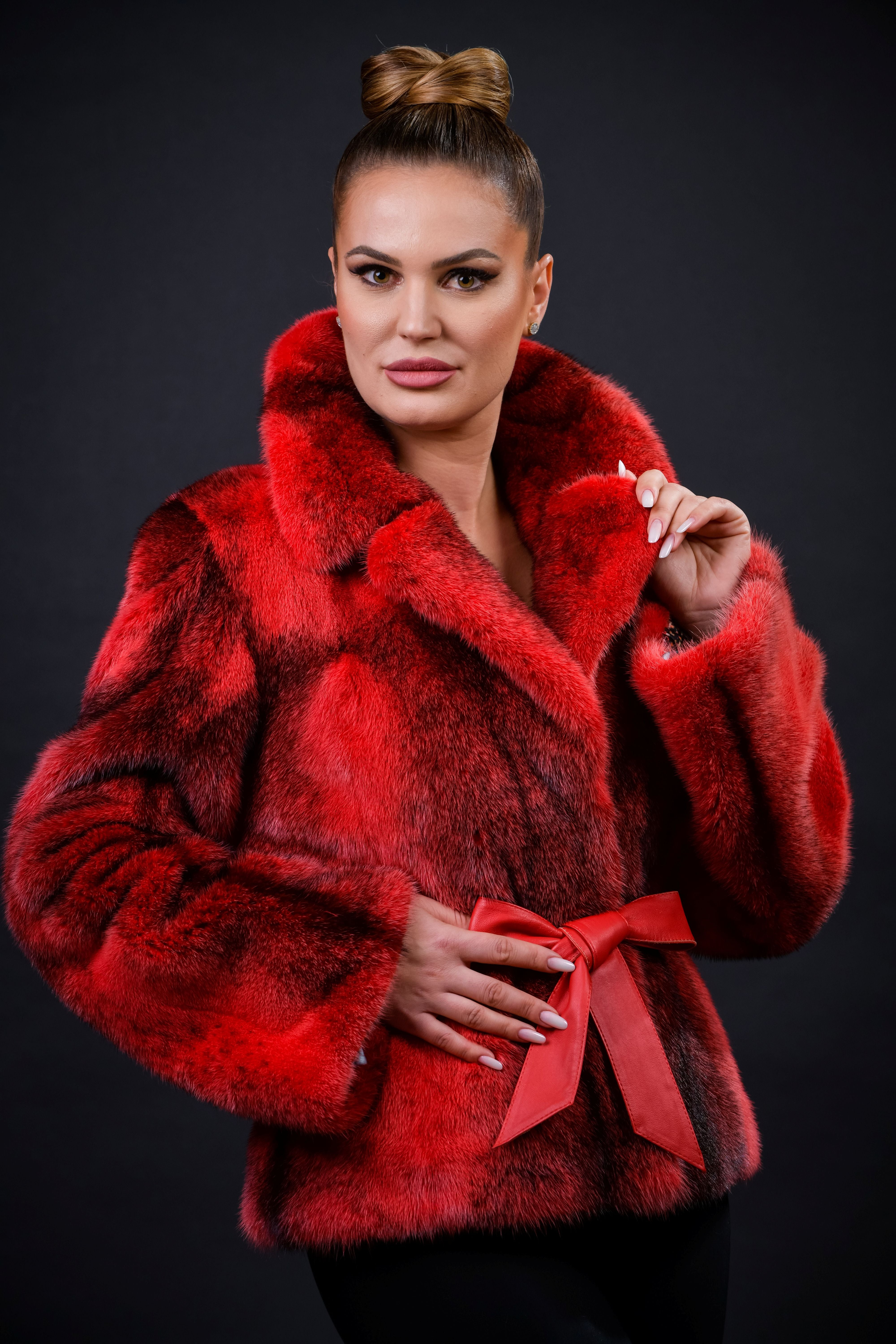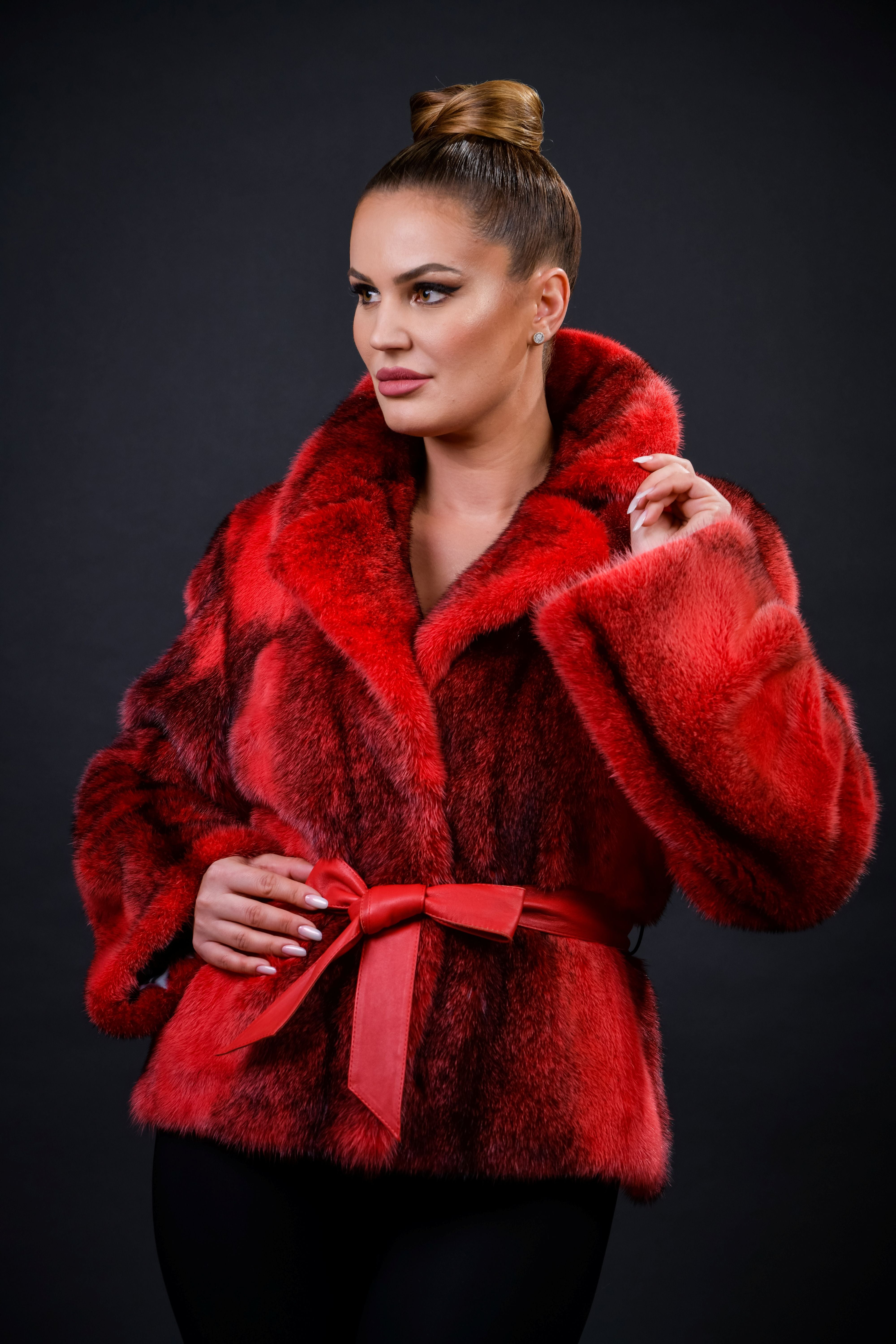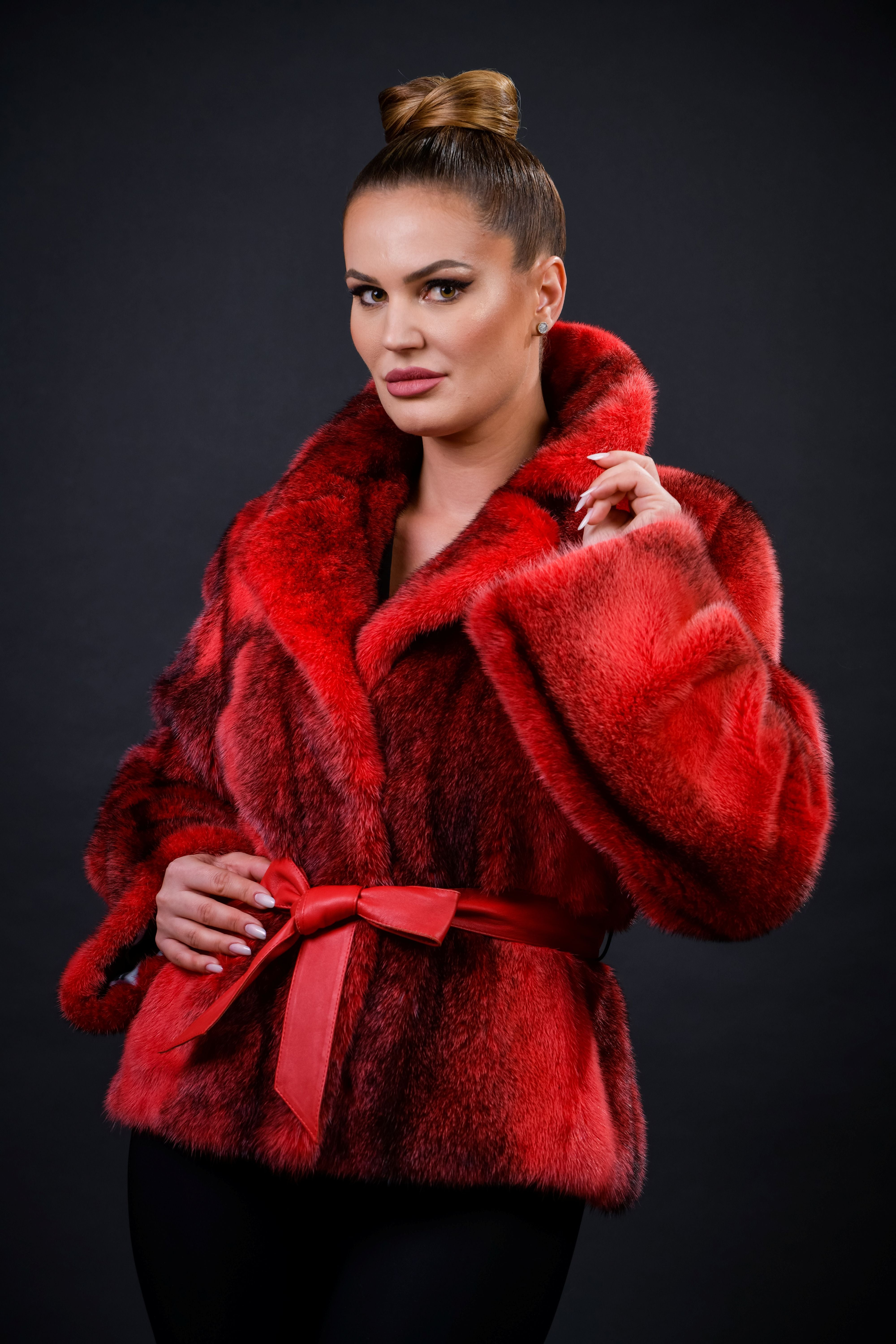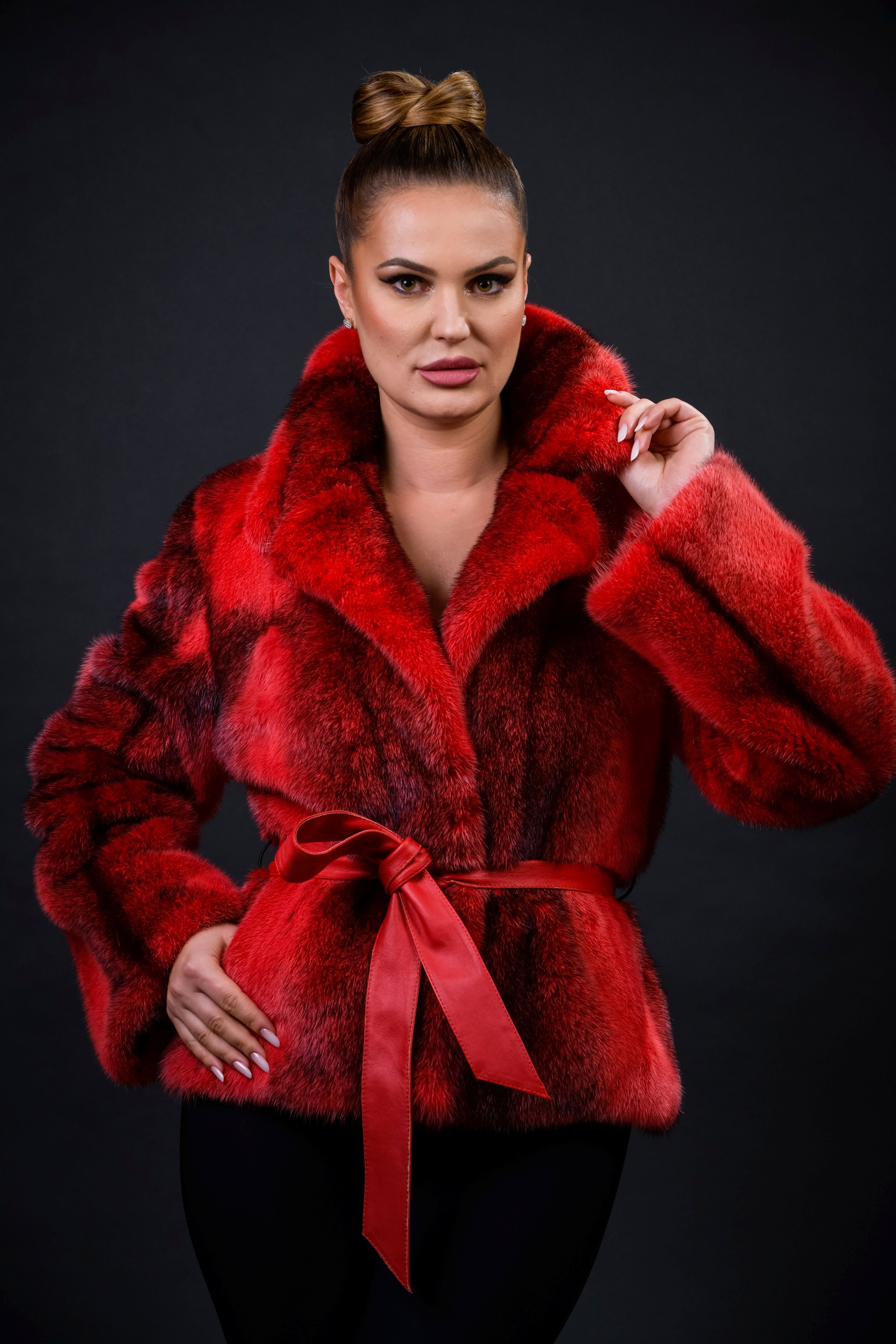 O piesă spectaculoasă și sofisticată, realizată din blană naturală de vizon în nuanță intensă Black Cross Roșu, deosebită și foarte apreciată pentru eleganța sa. Croiul pune în valoare silueta, iar cordonul în talie cambrează armonios trupul, evidențiind feminitatea.
