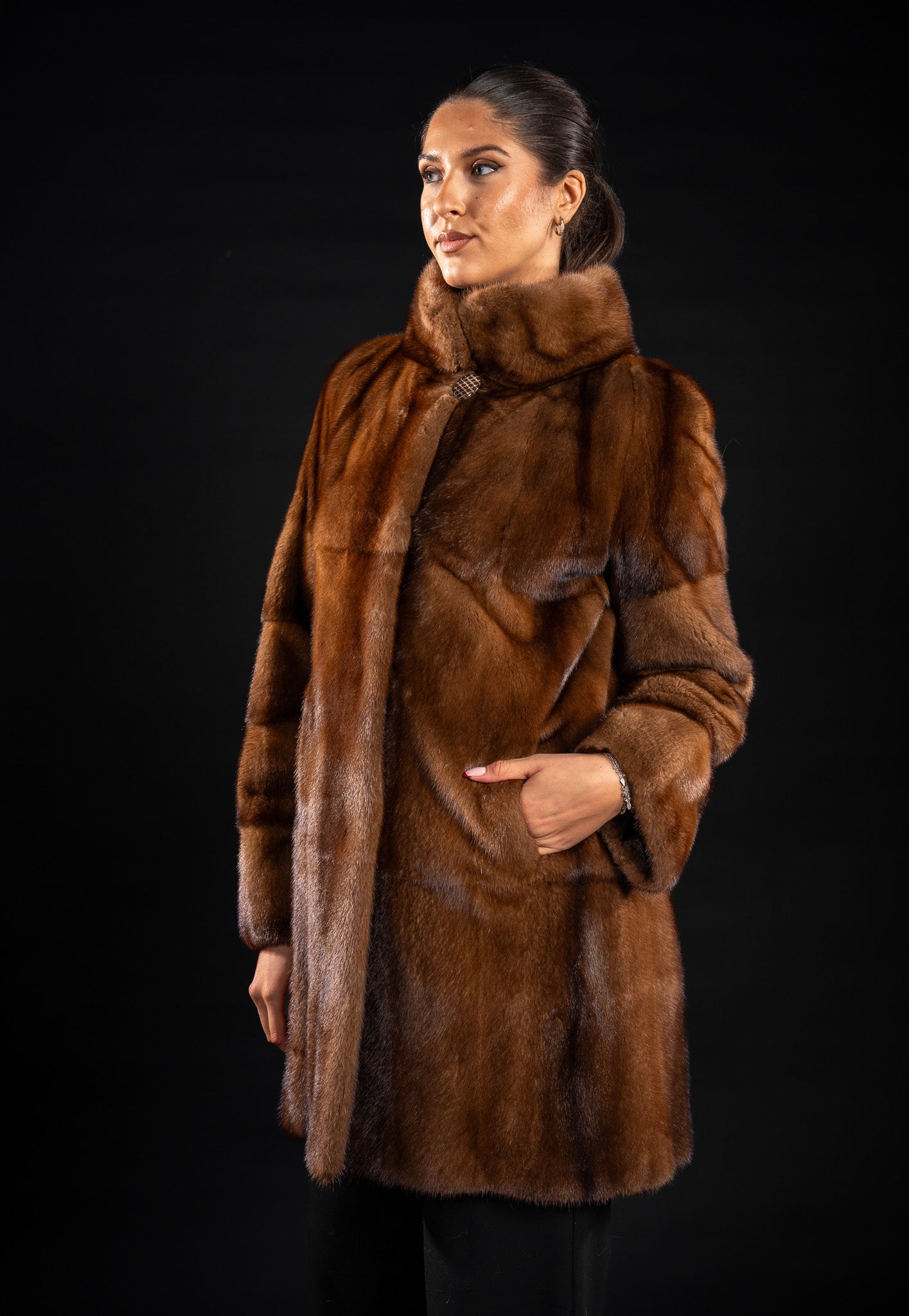Eleganță și rafinament într-un singur articol. Această haină din blană naturală de vizon, nuanță Demi Buff, prezintă un croi cambrat ce evidențiază silueta, cu o lungime de 90 cm oferind un aspect sofisticat și modern. Mâneci lungi și guler înalt pentru protecție optimă împotriva frigului, combinând confortul cu stilul.