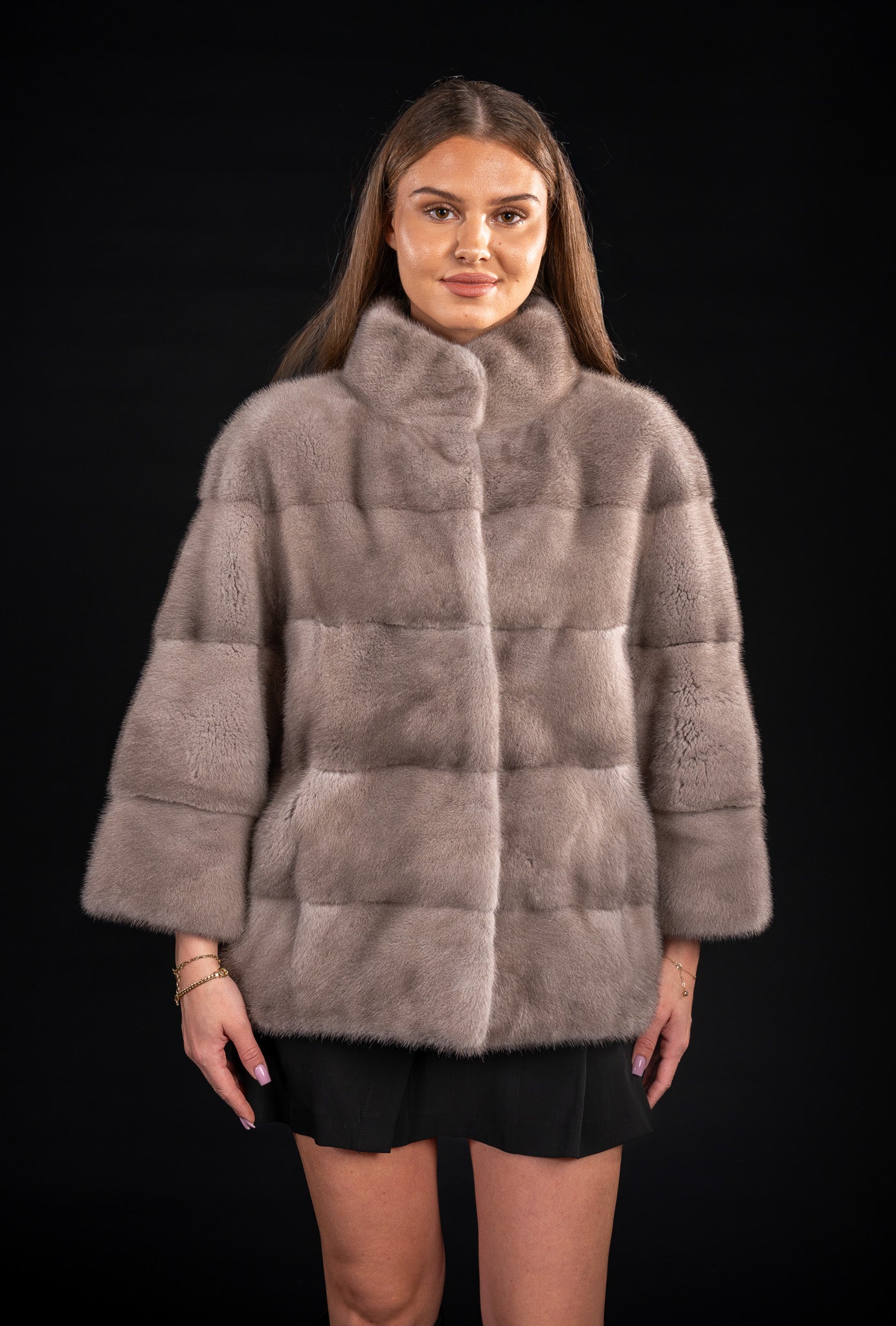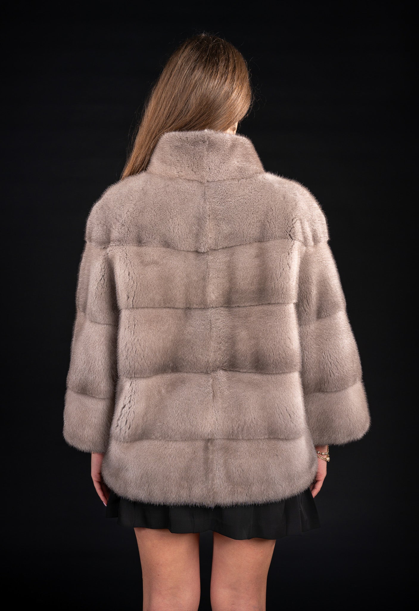 O piesă contemporană cu accente sofisticate, această haină din blană naturală de vizon, în nuanța modernă Graffiti, îmbină perfect eleganța clasică cu un aer actual și rafinat. Jocul subtil de tonuri naturale și griuri fine creează o textură vizuală spectaculoasă, scoțând în evidență frumusețea autentică a blănii.