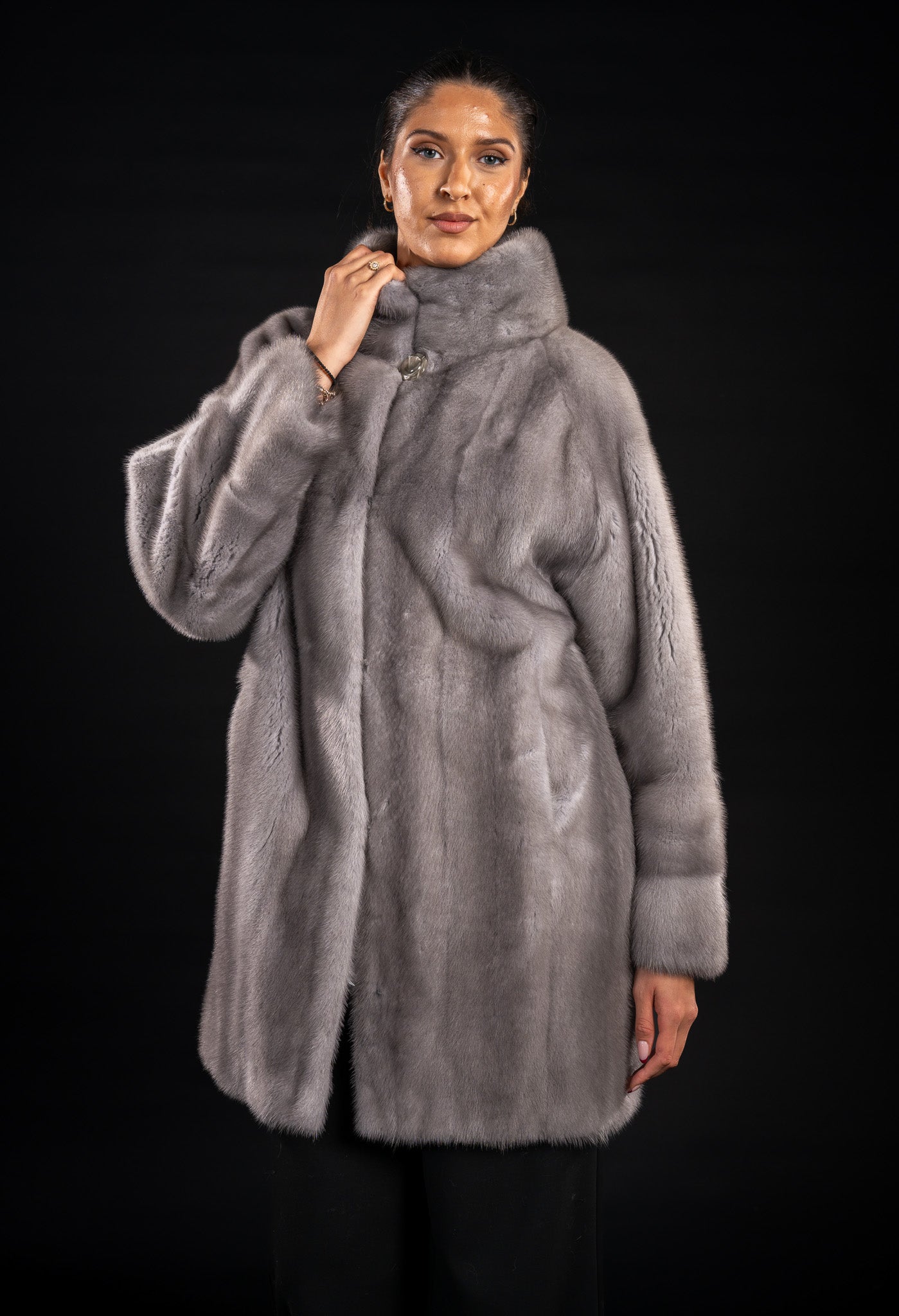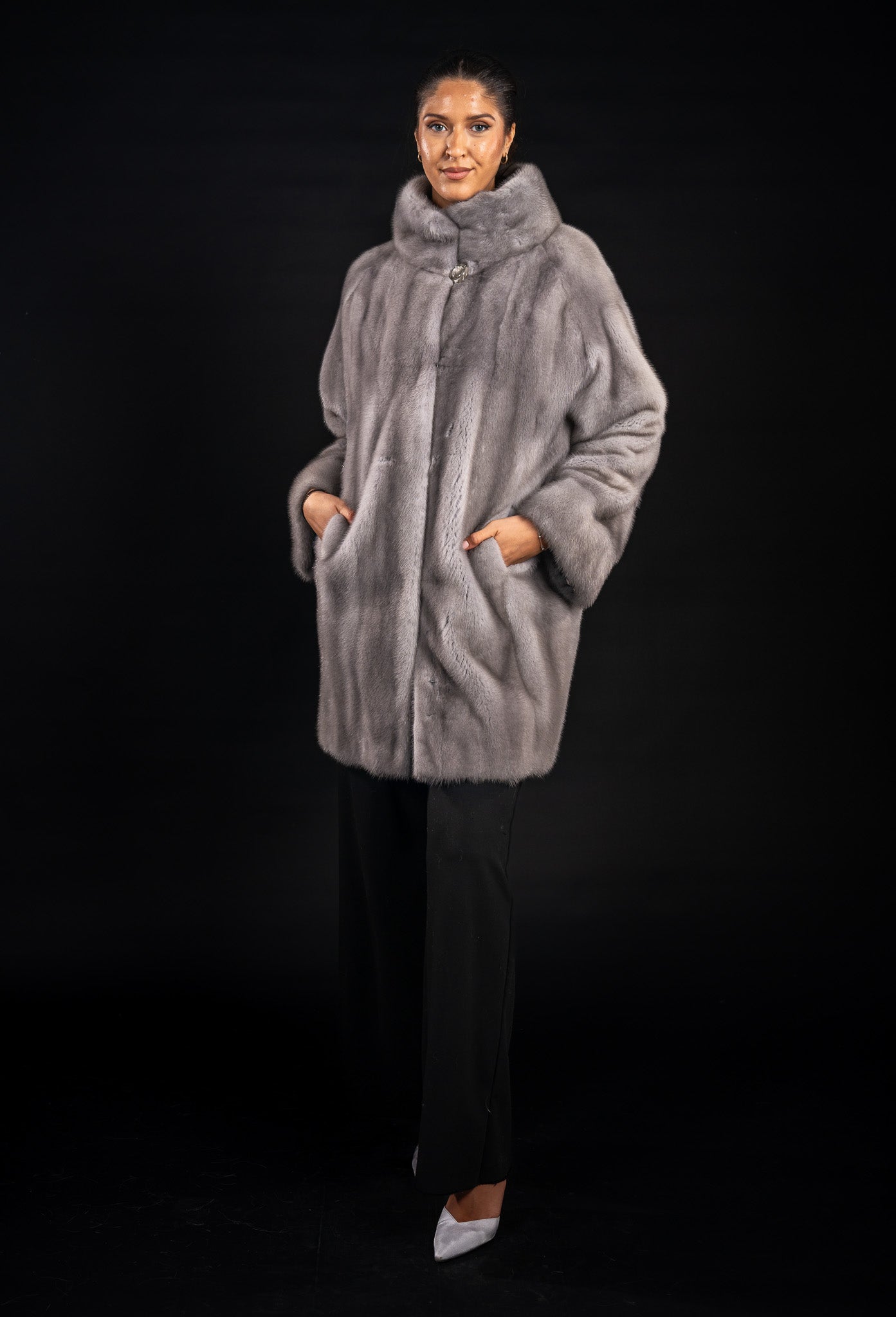 Eleganță și confort într-o singură piesă – această haină din blană naturală de vizon, într-o nuanță sofisticată Sapphire, îmbină luxul materialului cu o croială modernă și lejeră. Lungimea de 90 cm oferă protecție optimă și o siluetă elegantă, păstrând totodată libertatea de mișcare.