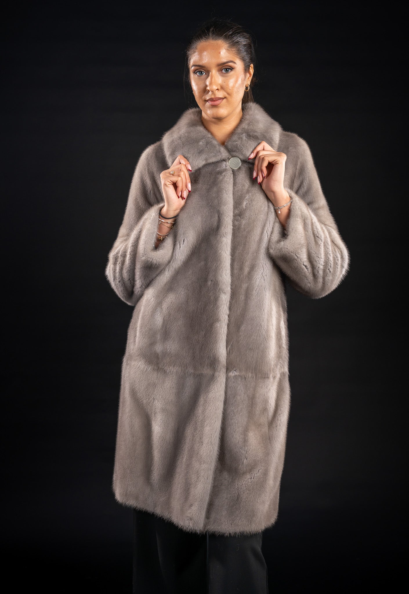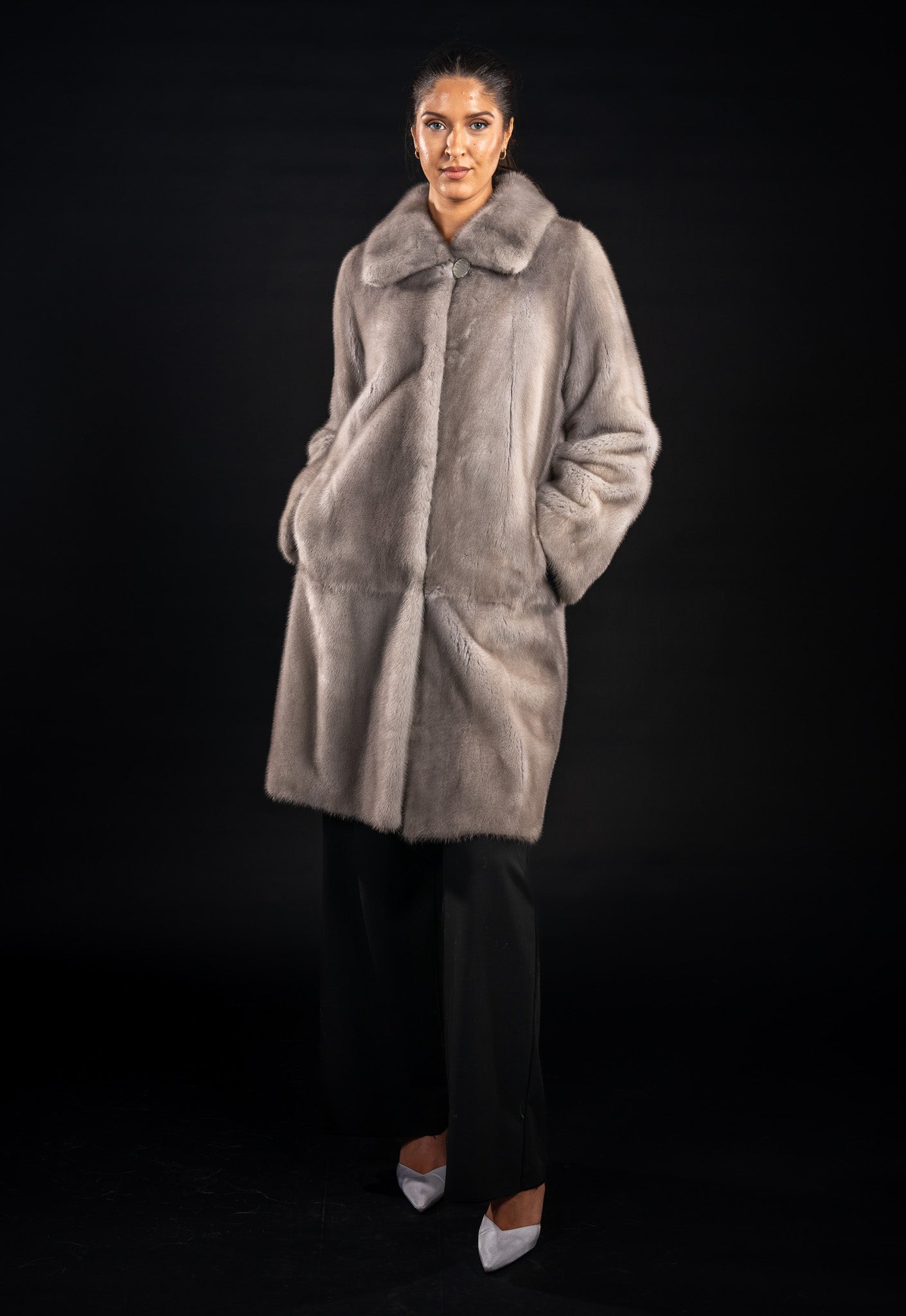 Designul lejer permite ca această haină să se așeze armonios pe diverse tipuri de siluetă, transformând-o într-o alegere ideală pentru zilele reci. Această haină din vizon Sapphire este o piesă atemporală, care îmbină căldura, confortul și stilul sofisticat – perfectă pentru femeia care apreciază luxul discret și eleganța naturală.