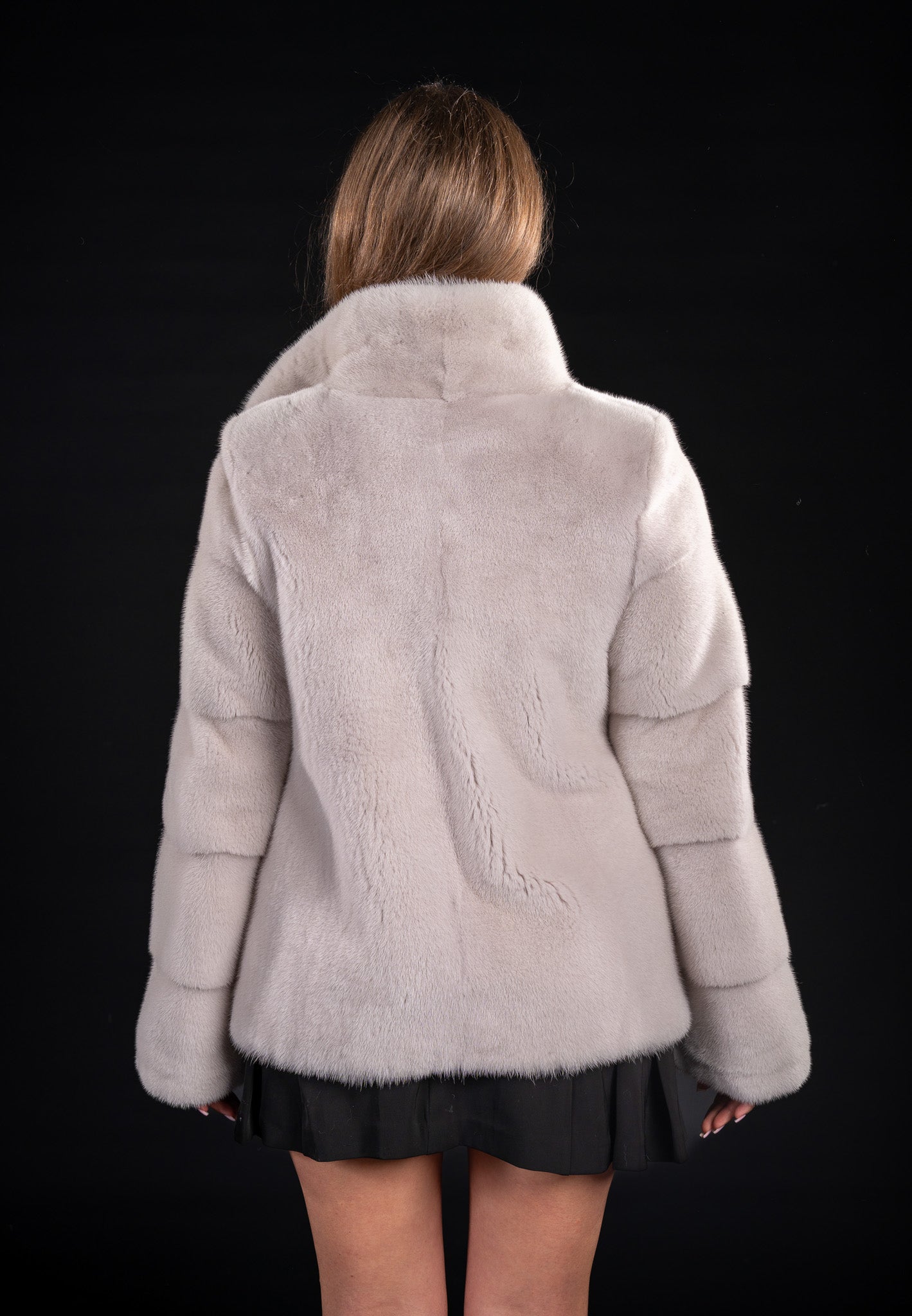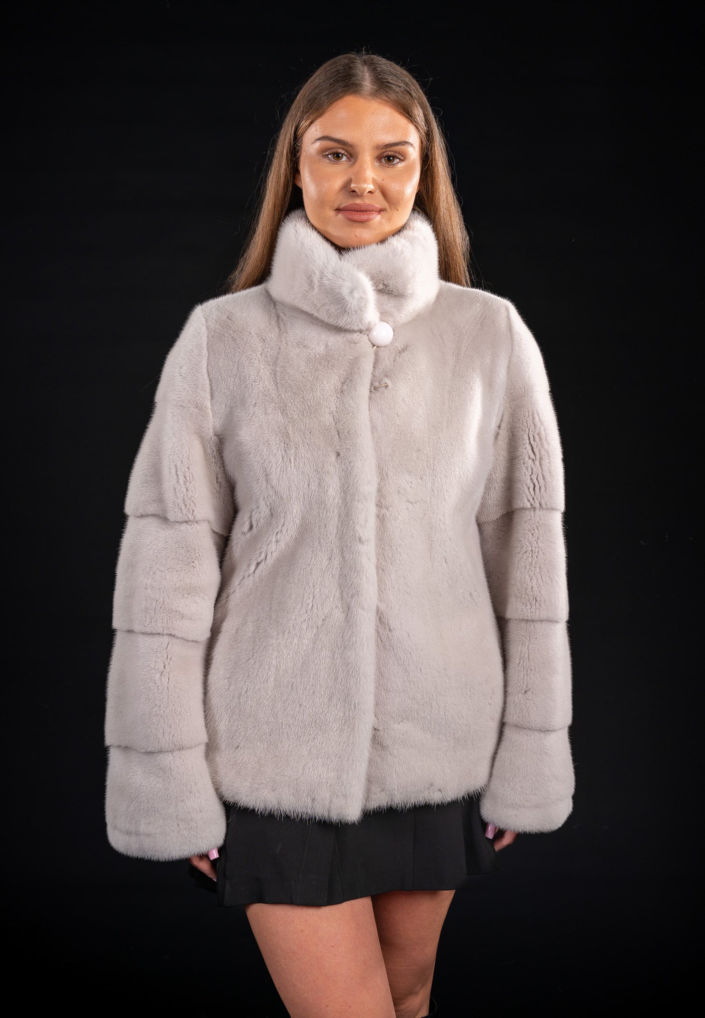 O piesă de eleganță desăvârșită, această haină din blană naturală de vizon în nuanța rafinată Ivoire impresionează prin finețea culorii sale calde și luminoase, ce emană puritate și rafinament. Textura moale și catifelată a blănii oferă un confort absolut, în timp ce luciul discret subliniază calitatea superioară a materialului.