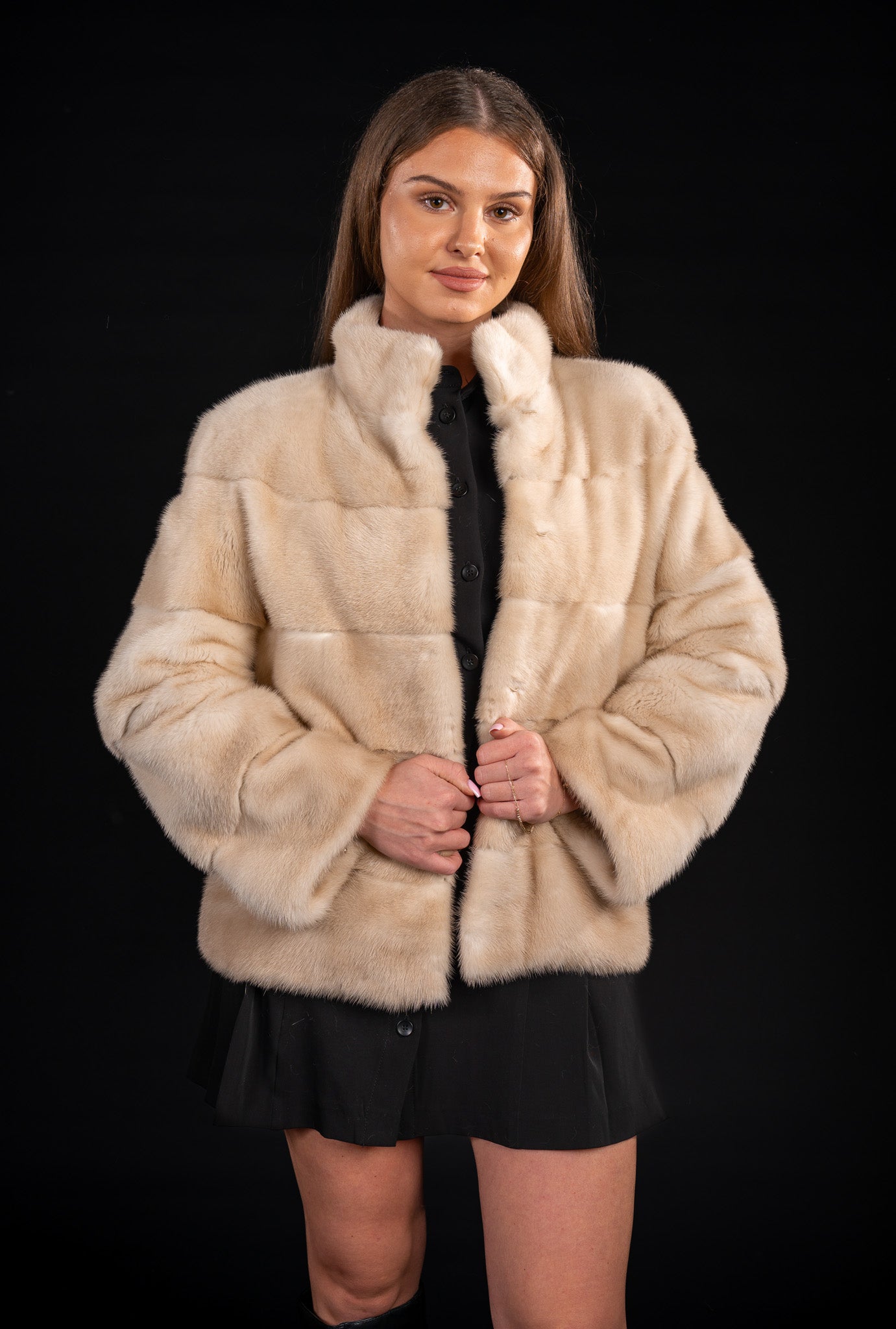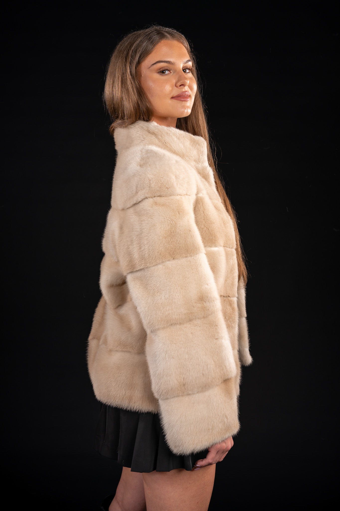 Rafinată și fermecătoare, această haină din blană naturală de vizon în nuanța sofisticată Perla cucerește prin eleganța sa atemporală și delicatețea tonurilor sidefate. Textura densă și catifelată a blănii oferă o senzație luxuriantă la atingere, în timp ce luciul fin al nuanței deschise adaugă luminozitate și distincție.