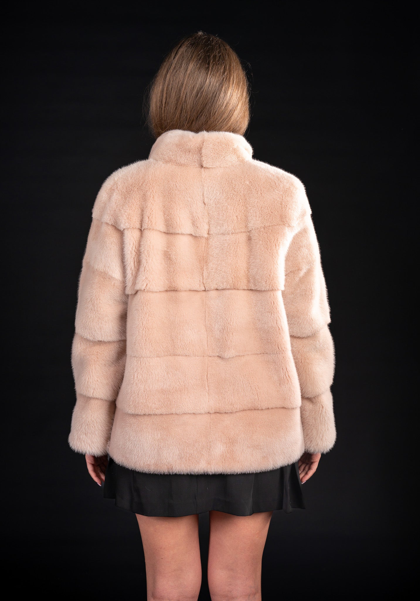 Rafinament și feminitate într-o singură piesă – această haină din blană naturală de vizon, într-o nuanță delicată de roz pudră, combină luxul natural cu un design modern și practic. Croiala sa atent realizată, cu lungime de 60 cm, oferă un echilibru perfect între eleganță și confort, fiind ideală pentru orice ținută de zi sau de seară.