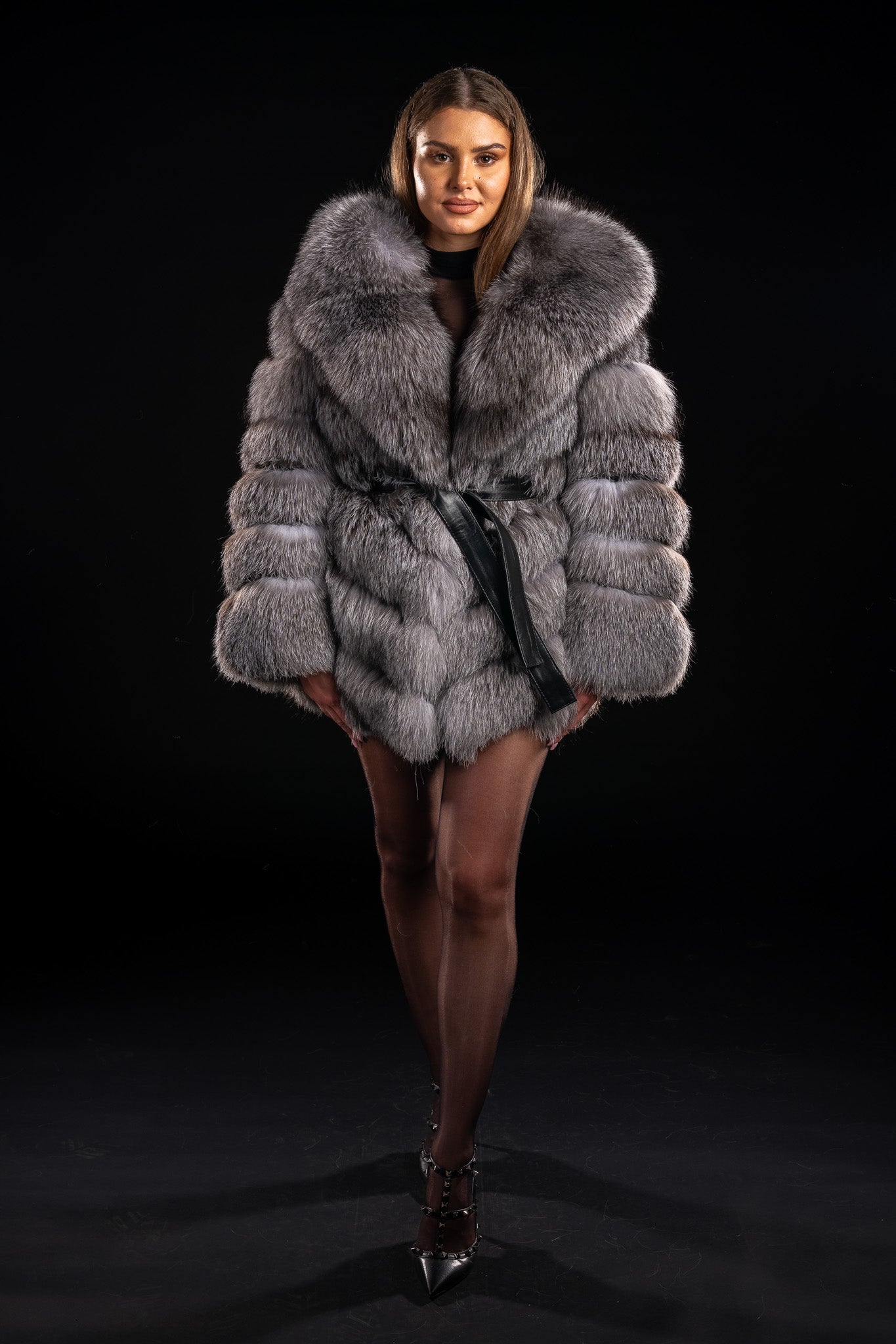 O capodoperă a rafinamentului, această haină din blană naturală de vulpe argintie impresionează prin bogăția și eleganța sa desăvârșită. Realizată în nuanța sa naturală, argintie, piesa se remarcă prin bucățile foarte late de blană, ce oferă volum, finețe și o textură luxuriantă.