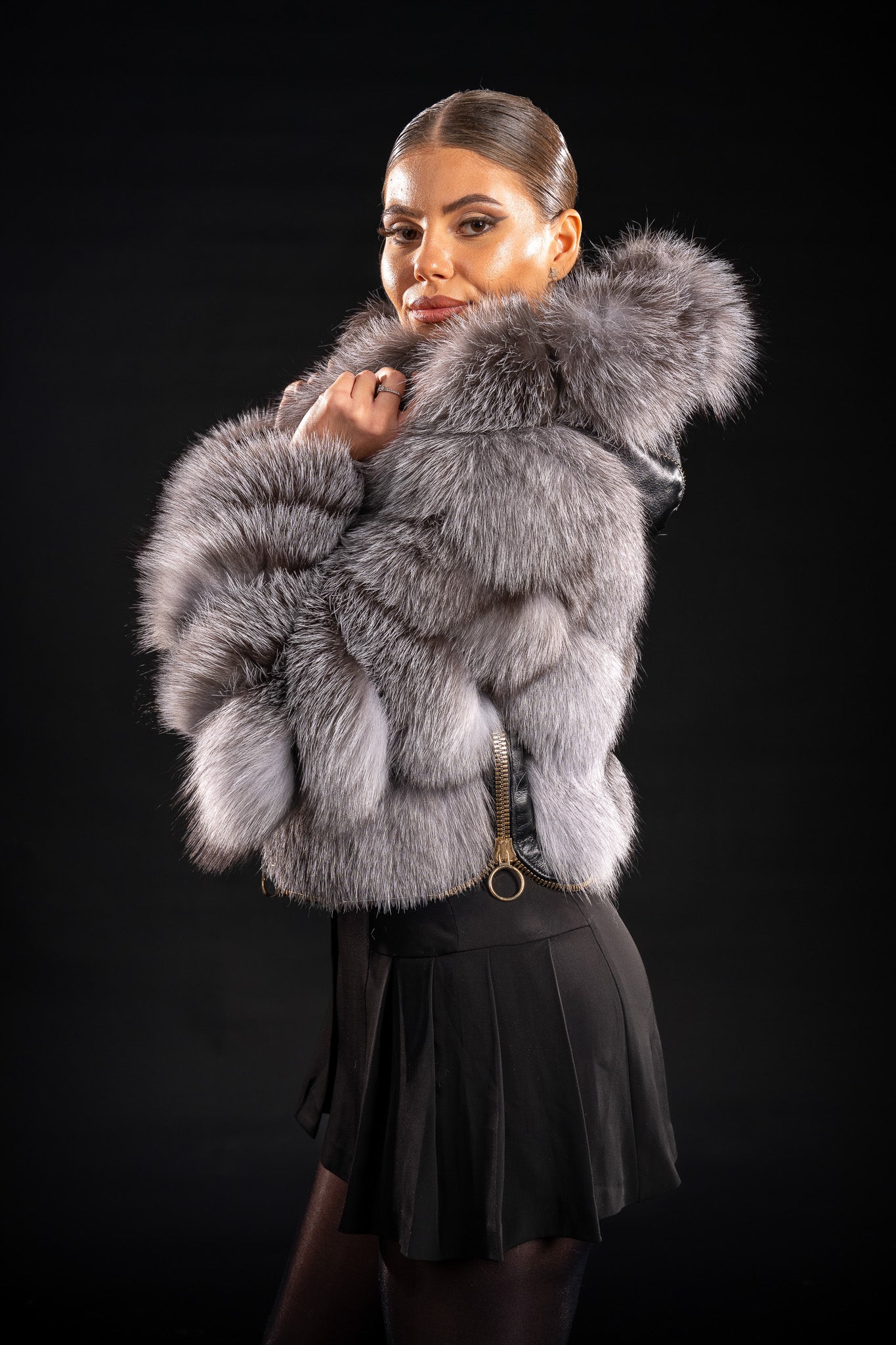 Răsfață-te cu rafinamentul unei piese de lux — această haină din blană naturală de Vulpe Argintie îmbină eleganța atemporală cu detaliile moderne. Blana bogată, cu reflexii naturale argintii, este completată de o glugă spectaculoasă, finisată pe margine cu aceeași blană luxuriantă, oferind un plus de volum și eleganță.