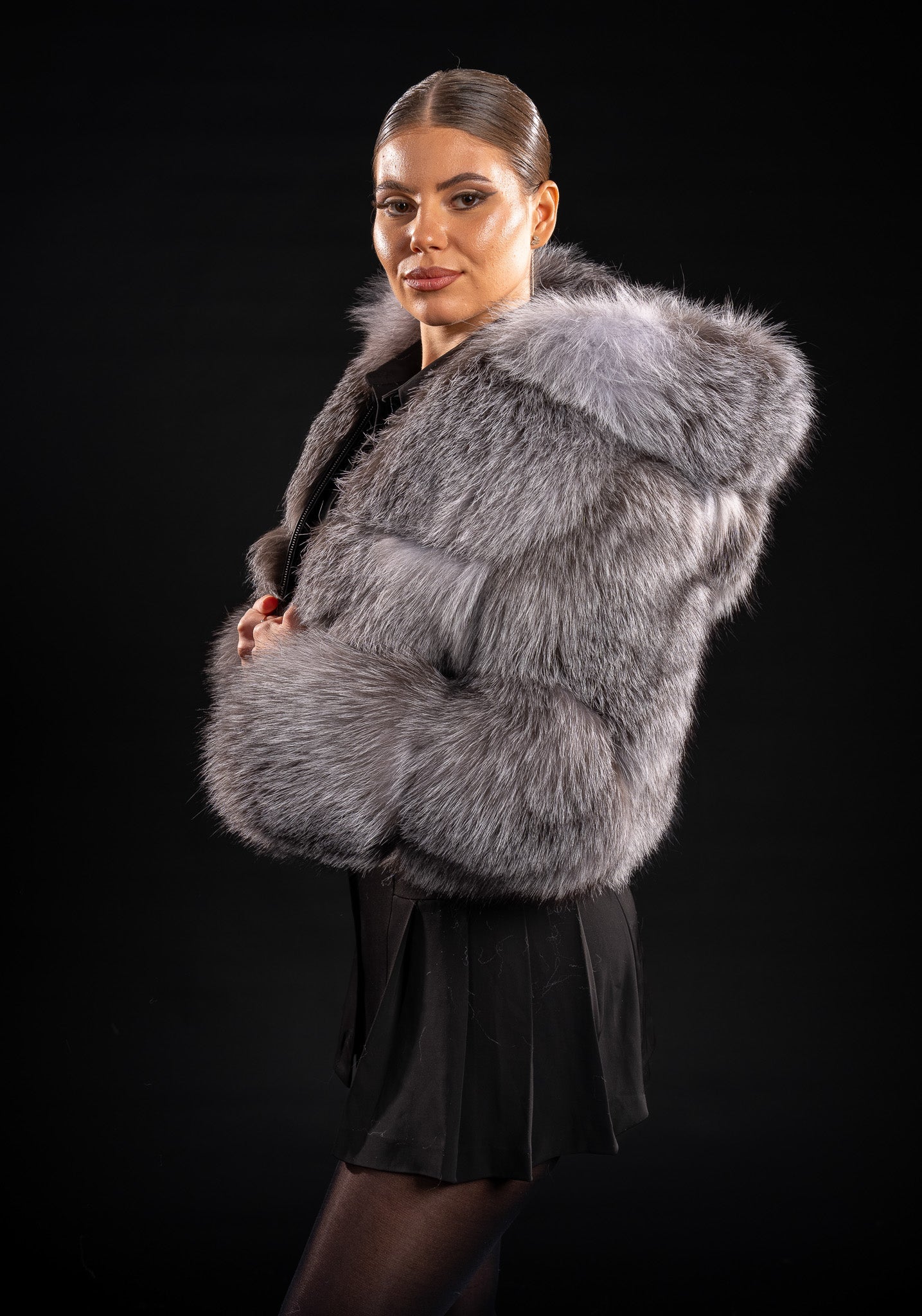 HAINA DIN BLANA NATURALA DE VULPE ARGINTIE CU GLUGA, FROST 004