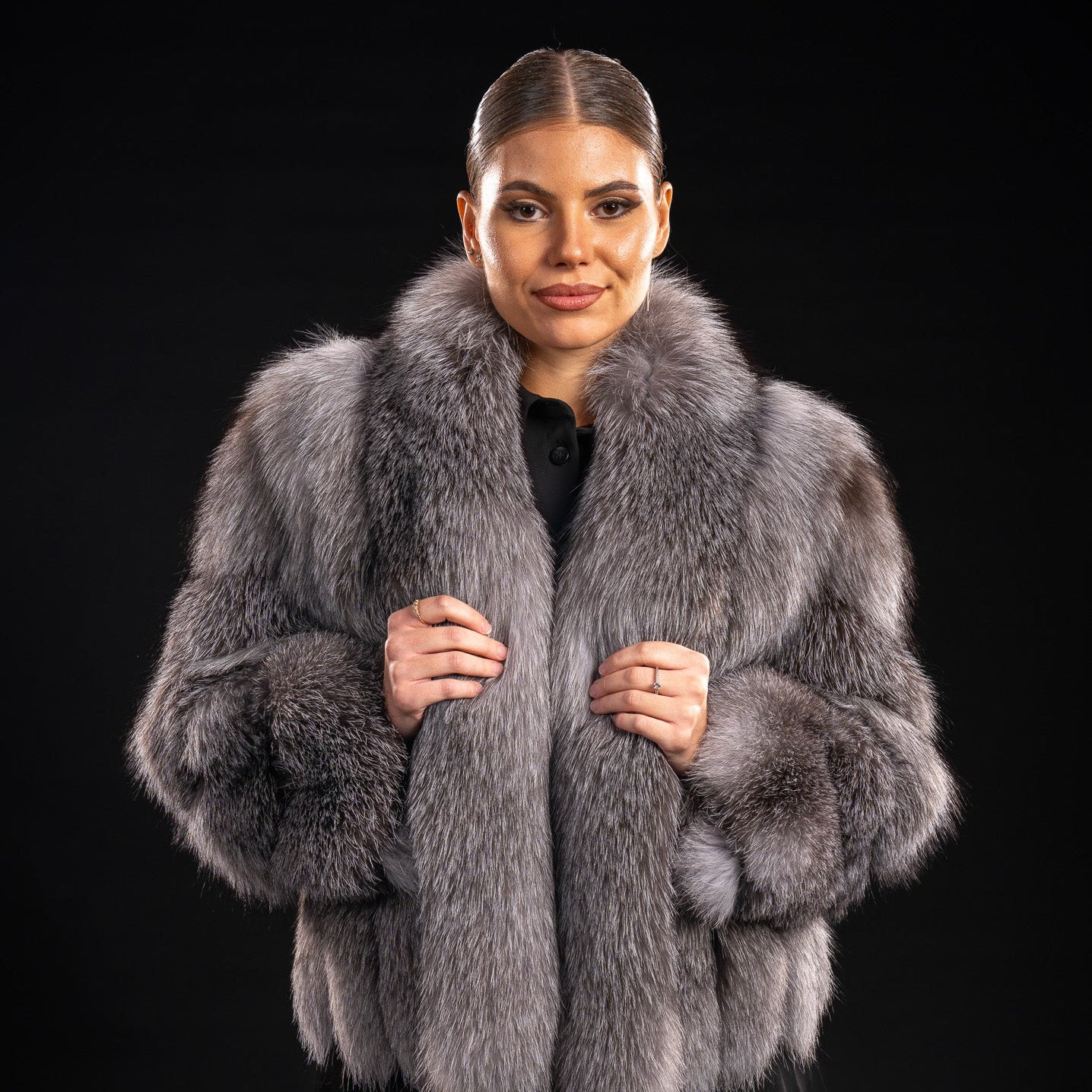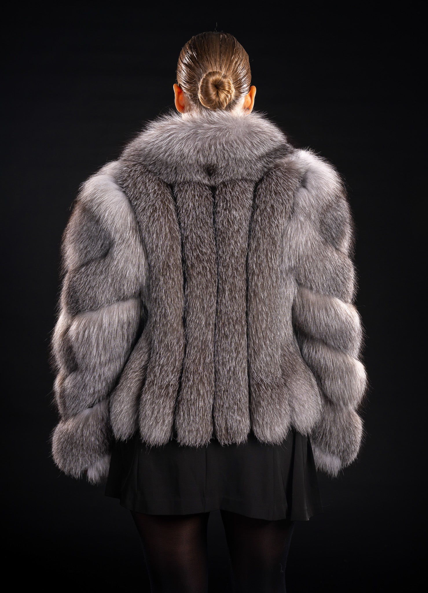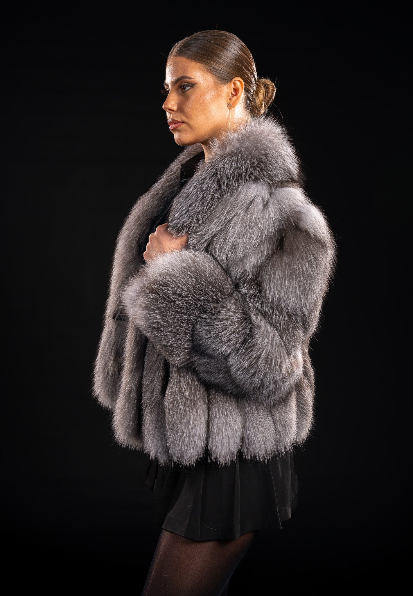 Această jachetă rafinată din vulpe argintie impresionează prin eleganța clasică și textura luxoasă a blănii naturale. Croiala sa liniară, verticală, alungește silueta și conferă o notă sofisticată, perfect echilibrată între stil modern și rafinament atemporal.
