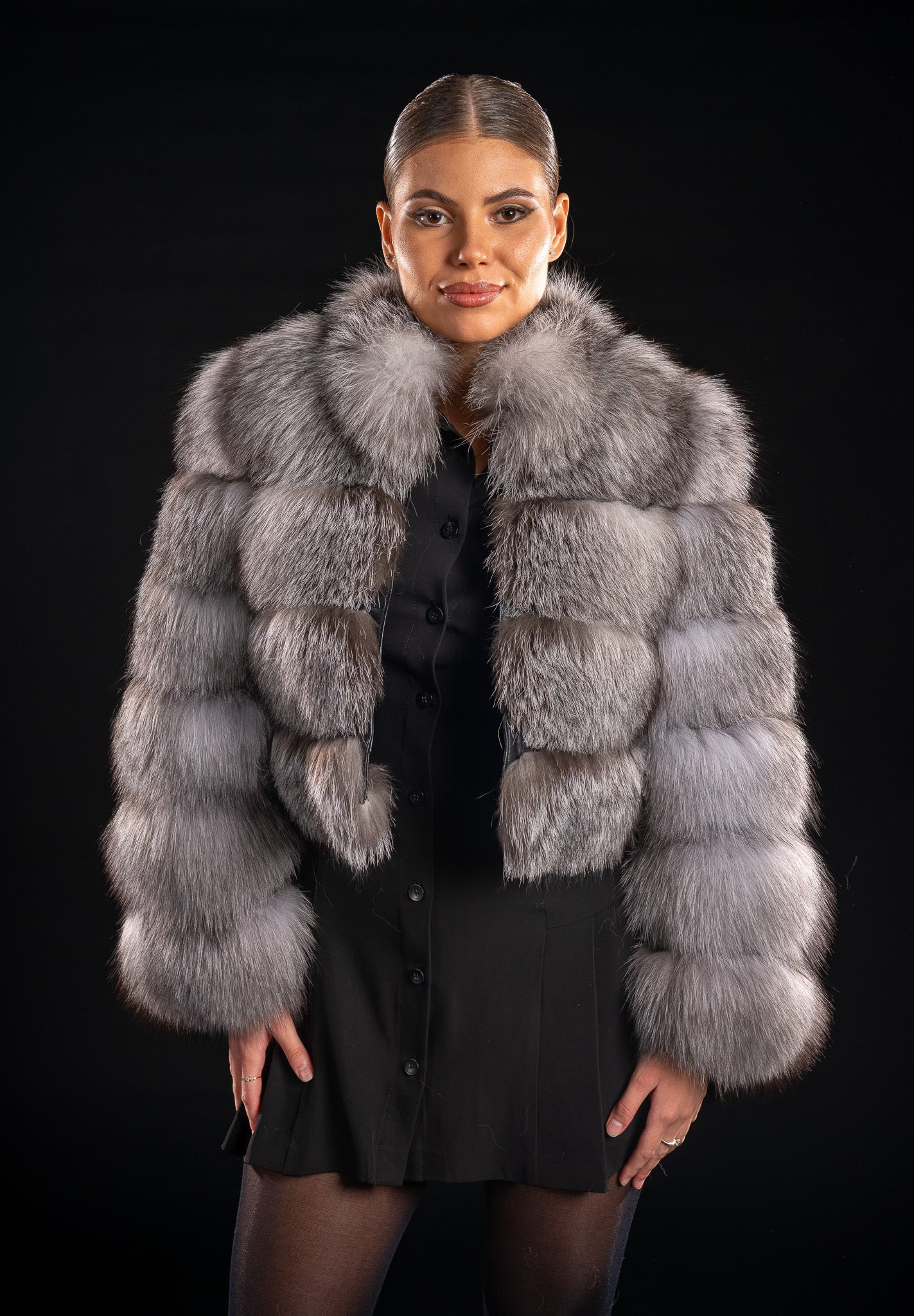 Haină sofisticată din vulpe argintie naturală, realizată din patru rânduri pline, ce se remarcă prin densitatea și strălucirea excepțională a blănii.