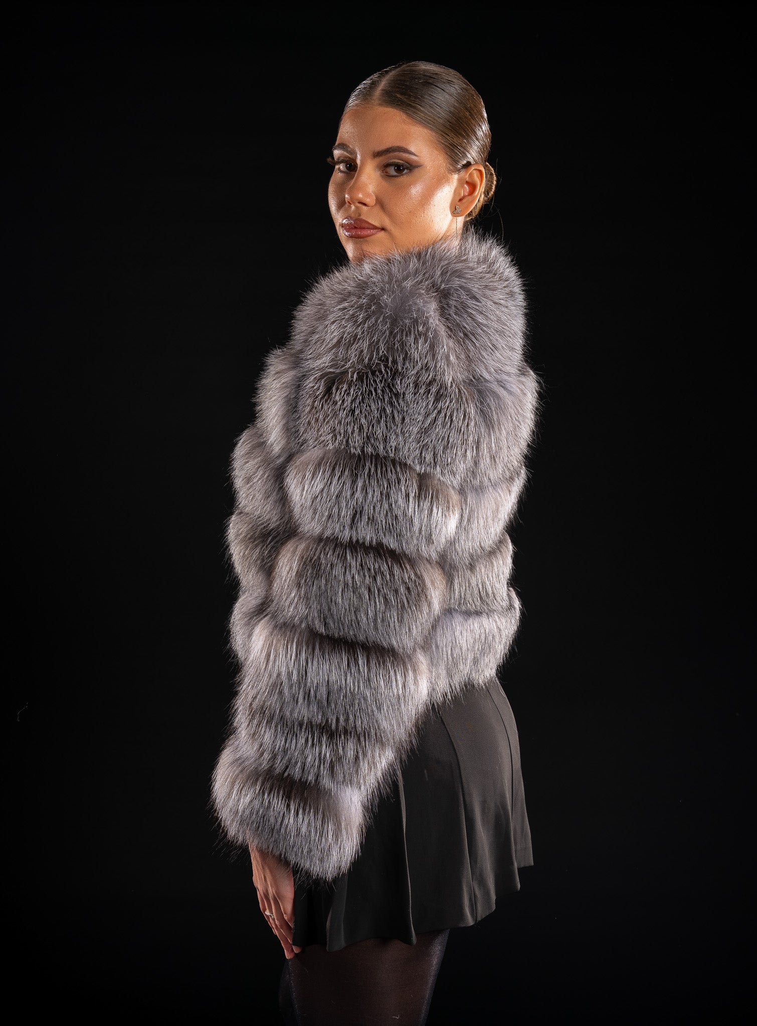 Haină sofisticată din vulpe argintie naturală, realizată din patru rânduri pline, ce se remarcă prin densitatea și strălucirea excepțională a blănii.