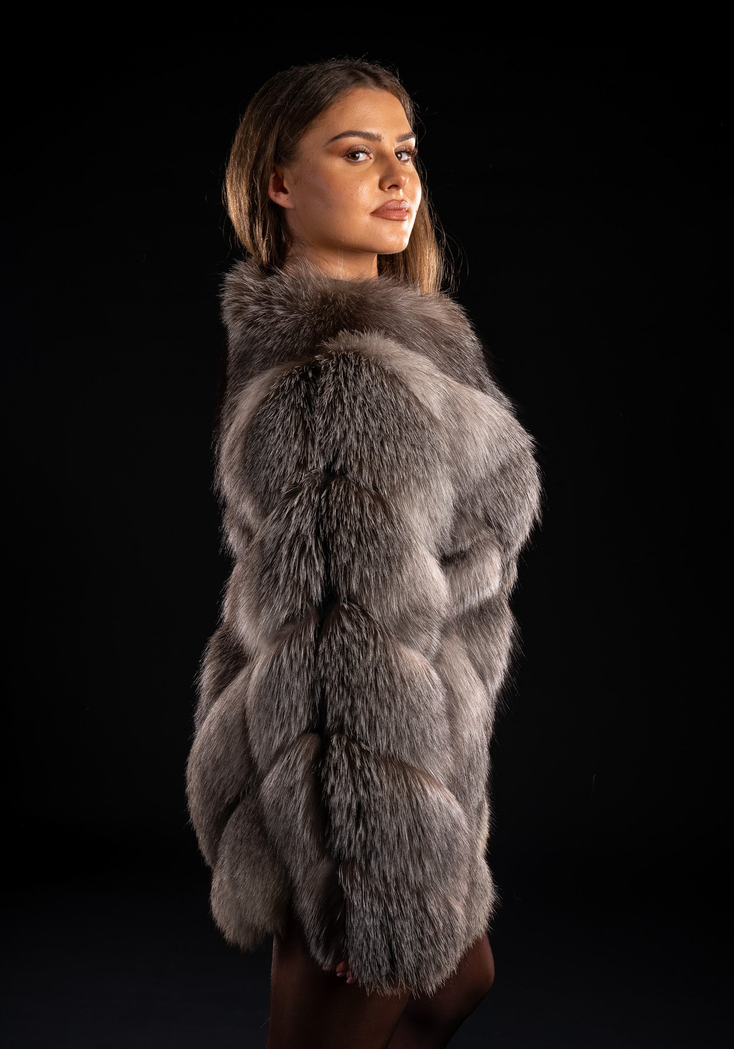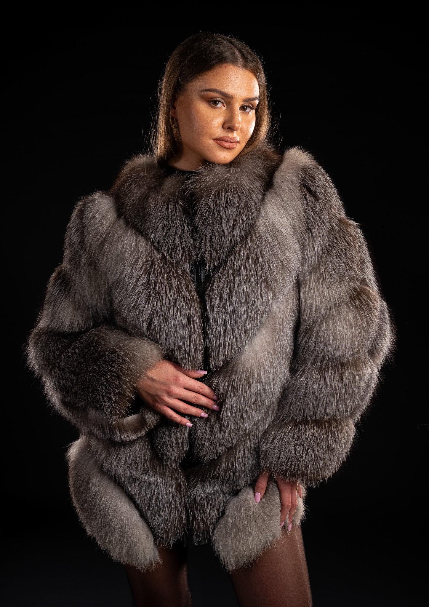Rafinament și versatilitate într-o singură piesă. Această haină spectaculoasă este realizată din cinci rânduri bogate de blană naturală de vulpe, dispuse într-un model elegant în formă de V, care alungește silueta și adaugă un plus de eleganță oricărei ținute. Bucățile de vulpe sunt late și luxuriante, oferind volum, textură și o strălucire naturală irezistibilă.