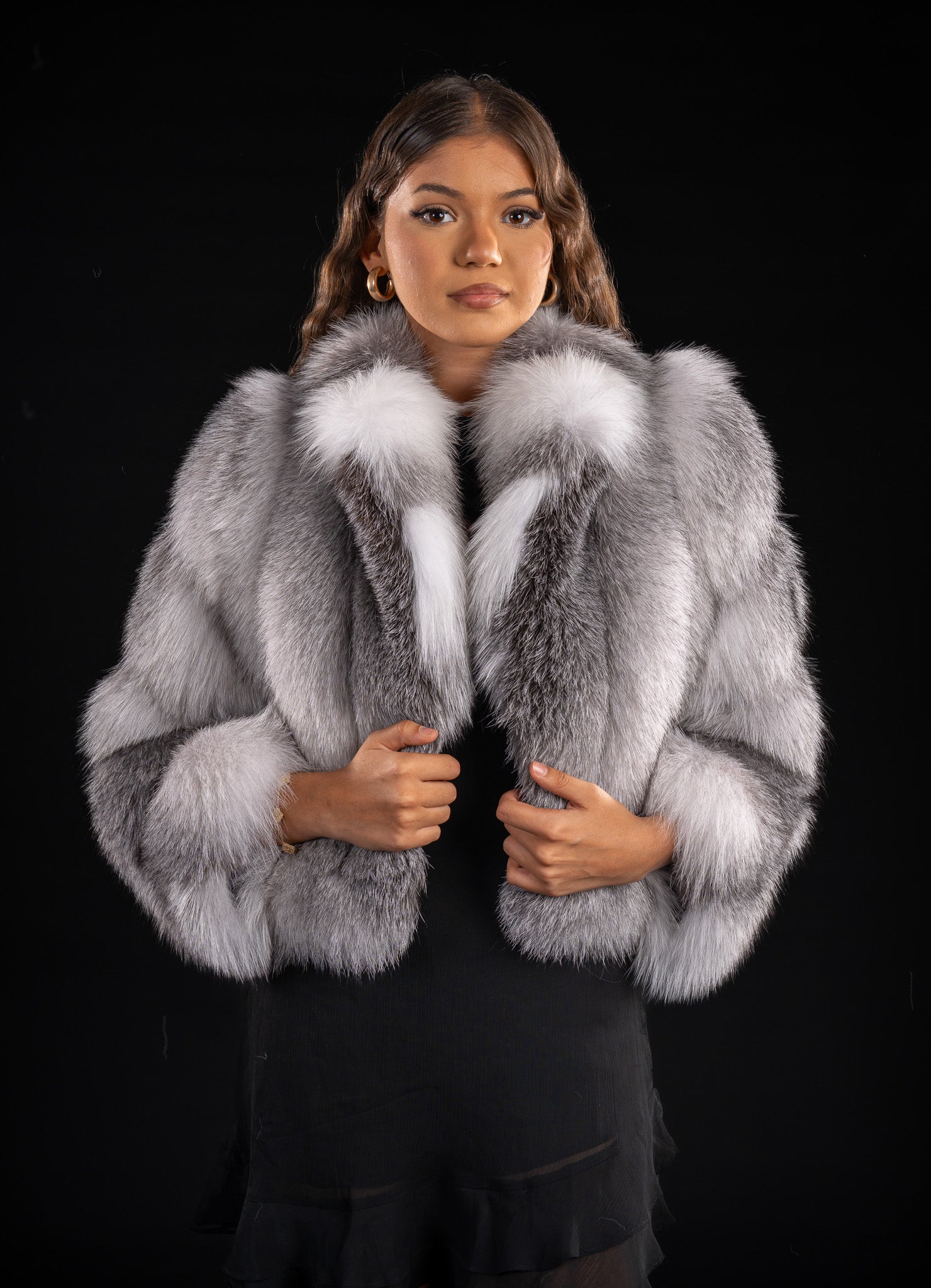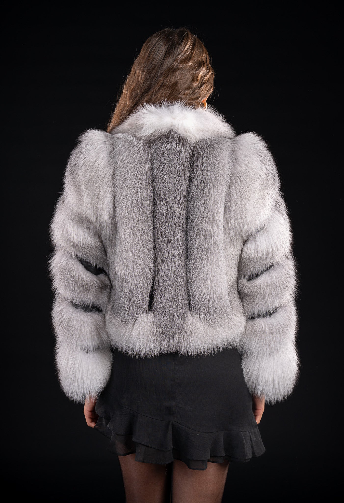 Această jachetă rafinată din vulpe artica impresionează prin eleganța clasică și textura luxoasă a blănii naturale. Croiala sa liniară, verticală, alungește silueta și conferă o notă sofisticată, perfect echilibrată între stil modern și rafinament atemporal.