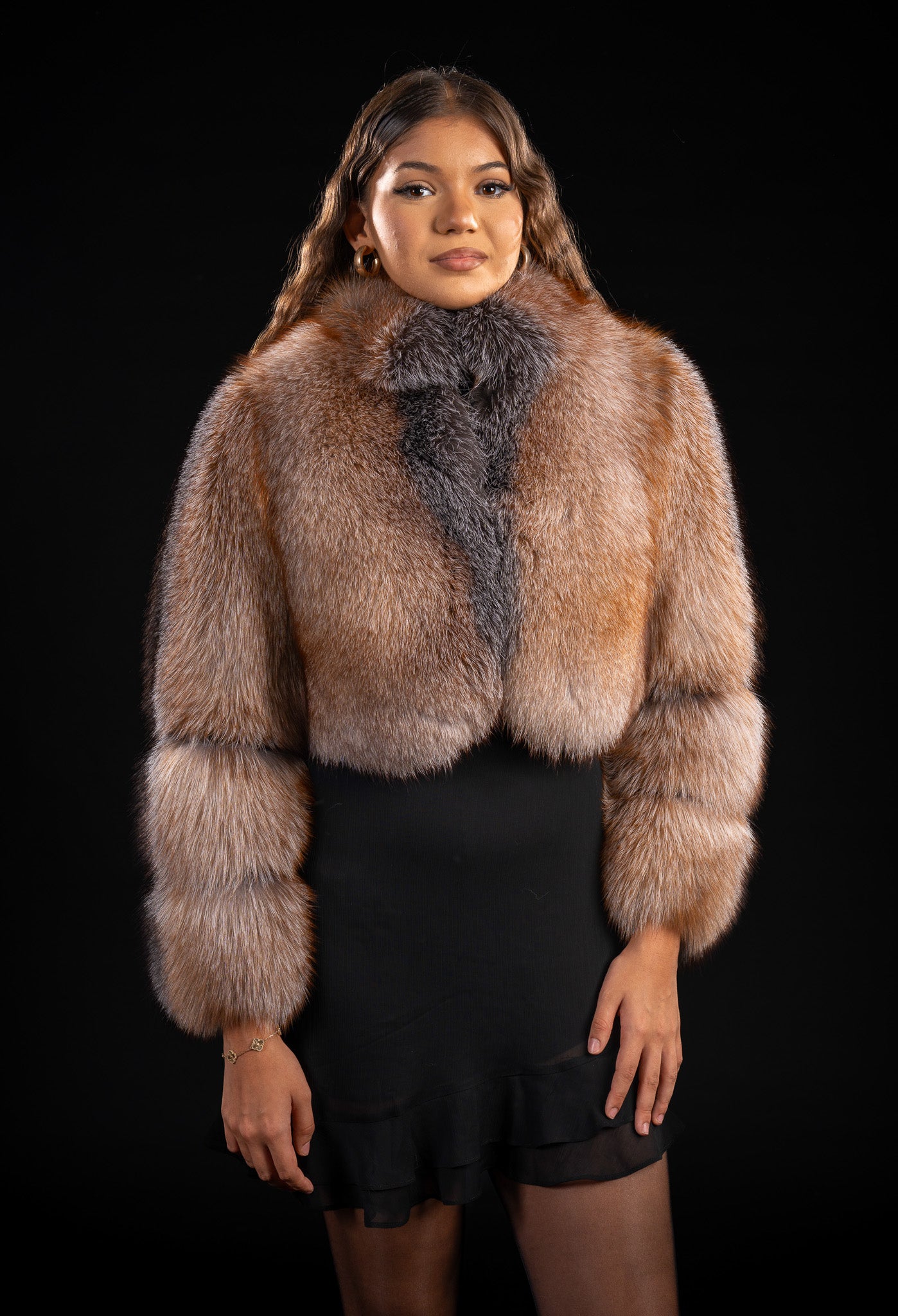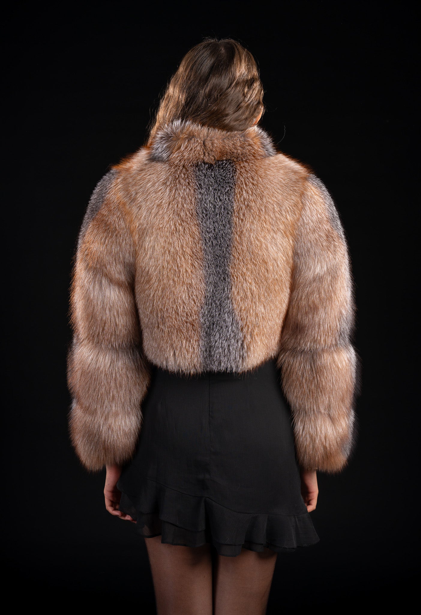 Această haină din blană naturală de vulpe Canadiana impresionează prin textura sa densă, fină și uniformă, realizată dintr-o singură bucată, care îi conferă un aspect spectaculos și deosebit. Croiala scurtă, de 40 cm, o face ideală pentru combinații elegante sau casual-chic.