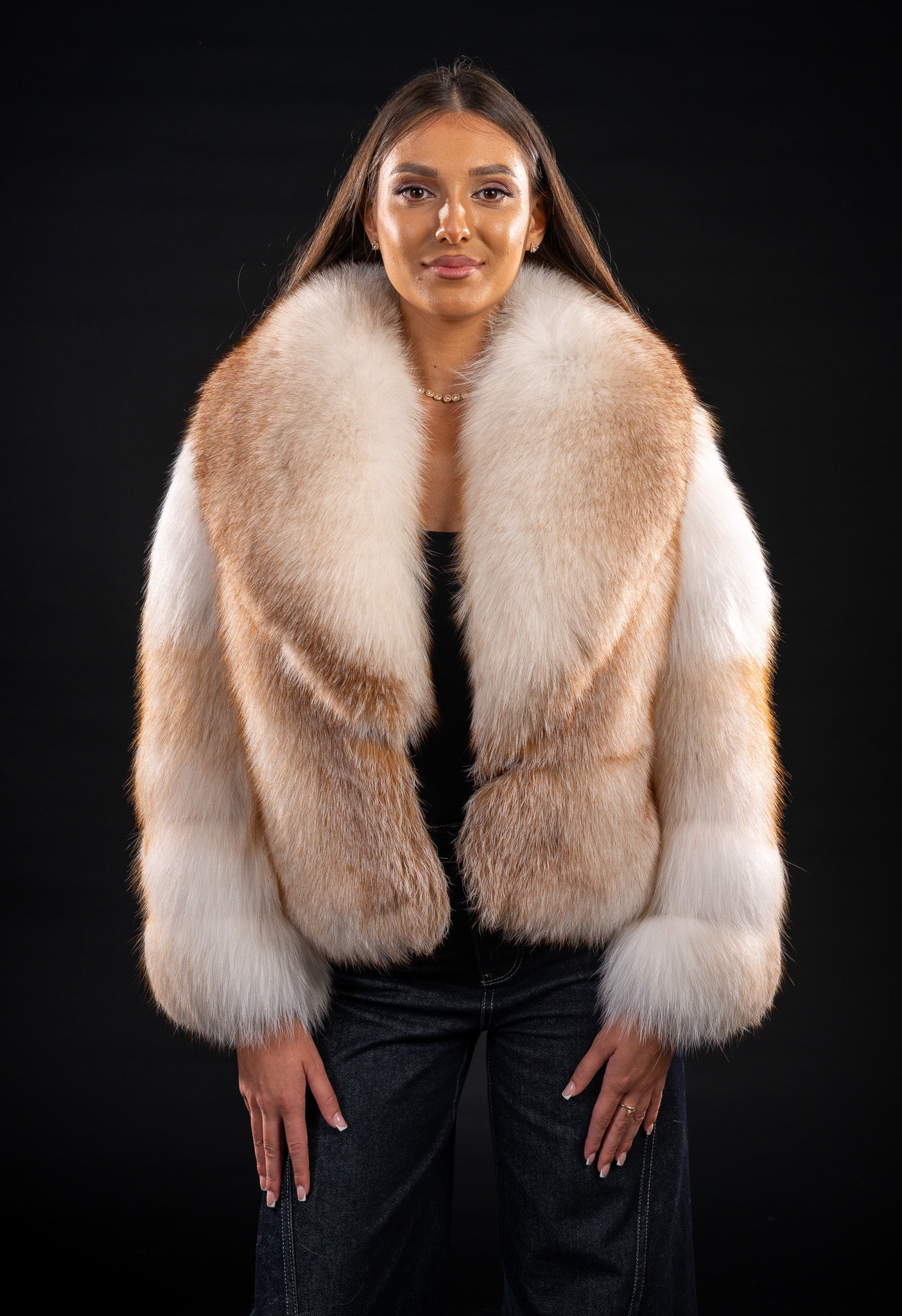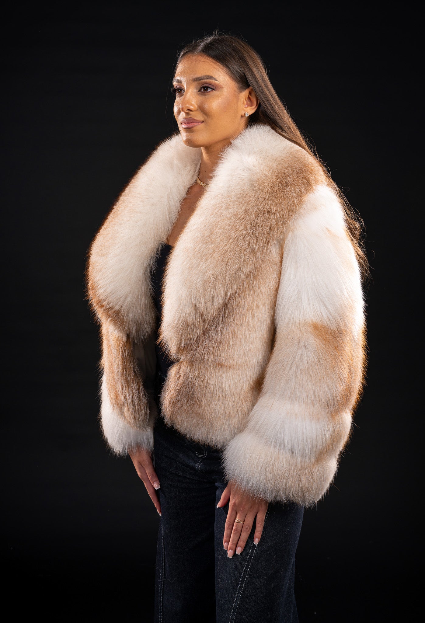 Această haină din blană naturală de vulpe, nuanța gold island, impresionează prin eleganța și luxul său desăvârșit. Modelul este realizat dintr-o singură bucată de blană, ceea ce îi conferă un aspect uniform și sofisticat, iar lungimea de 50 cm o face ideală pentru o purtare confortabilă și elegantă. Gulerul tip rever adaugă rafinament, iar sistemul de închidere prin clipsuri asigură un confort rapid și practic. Blana extrem de bogată și fină oferă senzația de căldură și opulență, în timp ce nuanța spectaculoasă și croiala atent lucrată transformă fiecare apariție într-un statement de stil și personalitate. Ideală pentru femeia care dorește să combine luxul cu eleganța atemporală.
