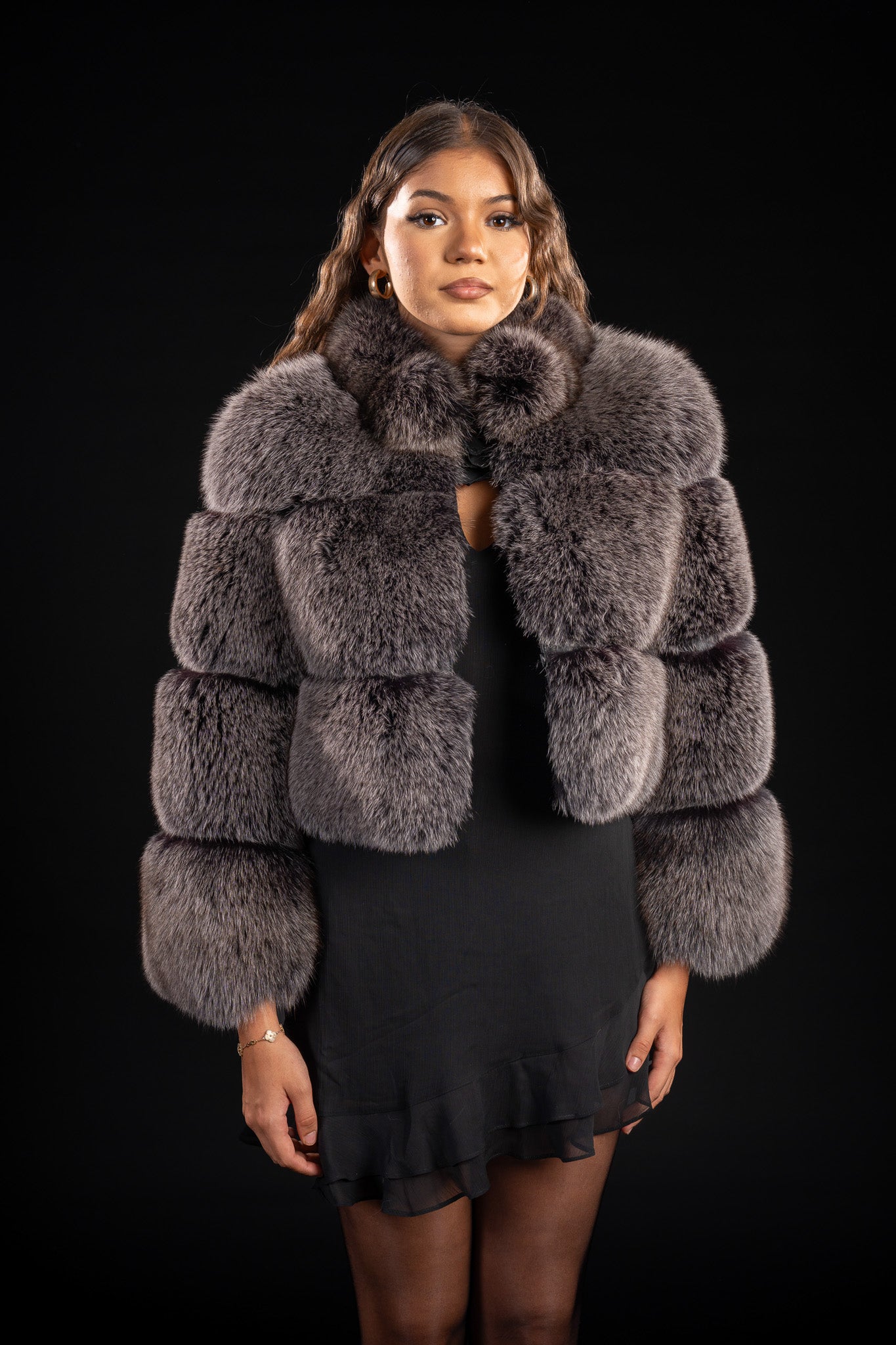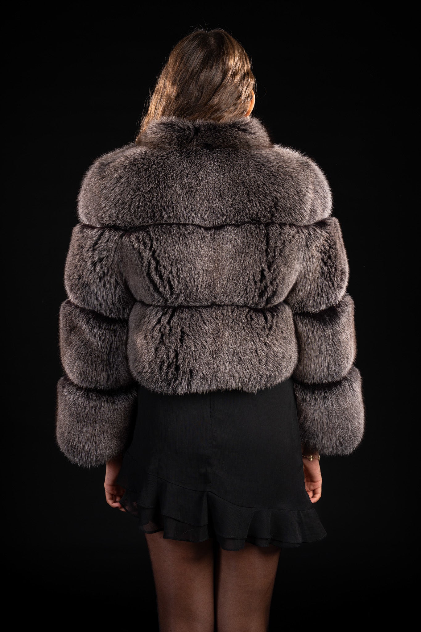 Haină sofisticată din vulpe polara argintie naturală, realizată din trei rânduri pline, ce se remarcă prin densitatea și strălucirea excepțională a blănii.