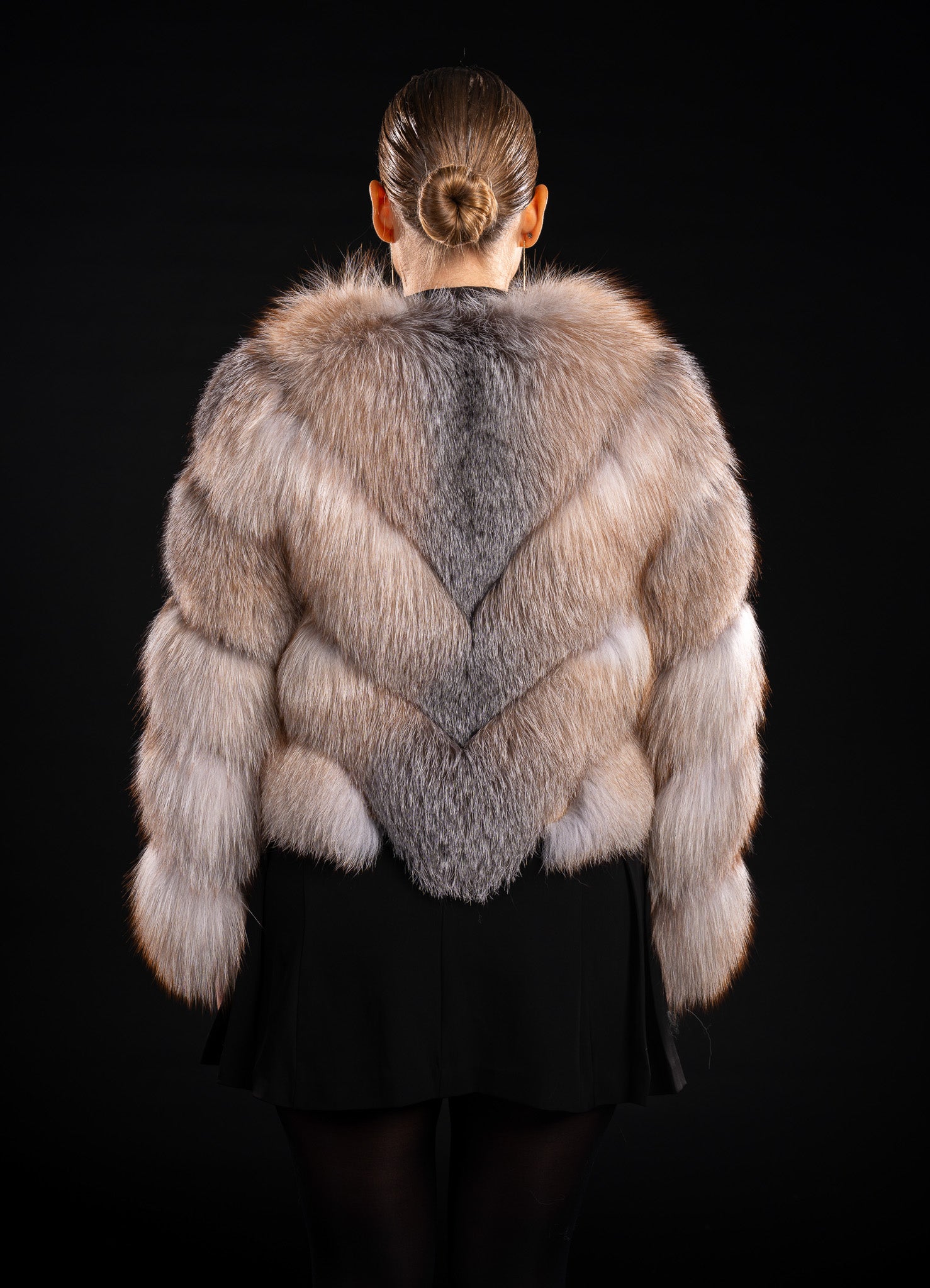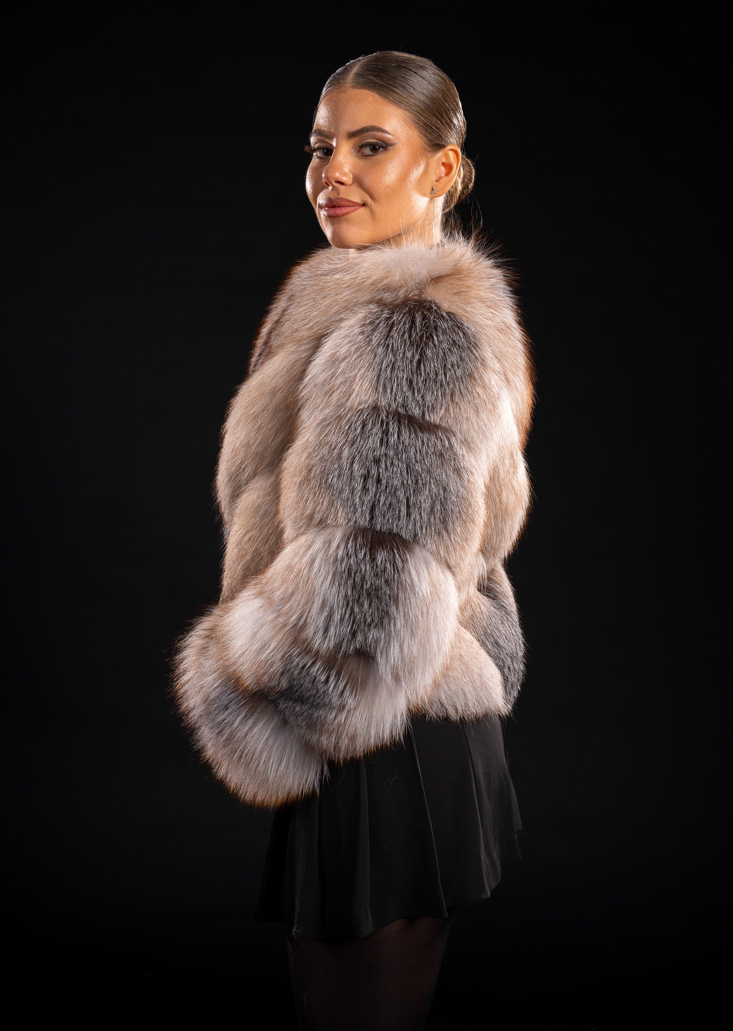 Fermoarele de închidere și cele pentru mâneci sunt discret ascunse sub blană, pentru un aspect curat și rafinat. Bucățile de vulpe sunt late și generoase, oferind volum și plenitudine, în timp ce substratul de piele naturală asigură confort, durabilitate și un finisaj luxos.