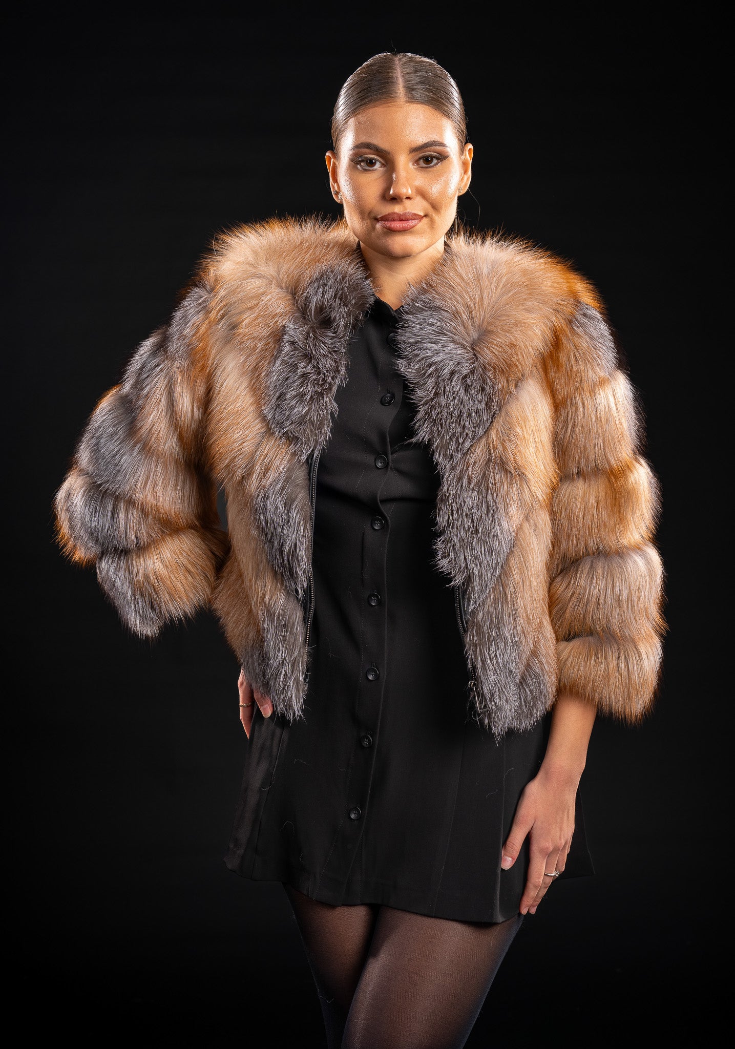 Fermoarele de închidere și cele pentru mâneci sunt discret ascunse sub blană, pentru un aspect curat și rafinat. Bucățile de vulpe sunt late și generoase, oferind volum și plenitudine, în timp ce substratul de piele naturală asigură confort, durabilitate și un finisaj luxos. Mânecile 3/4 completează look-ul elegant.