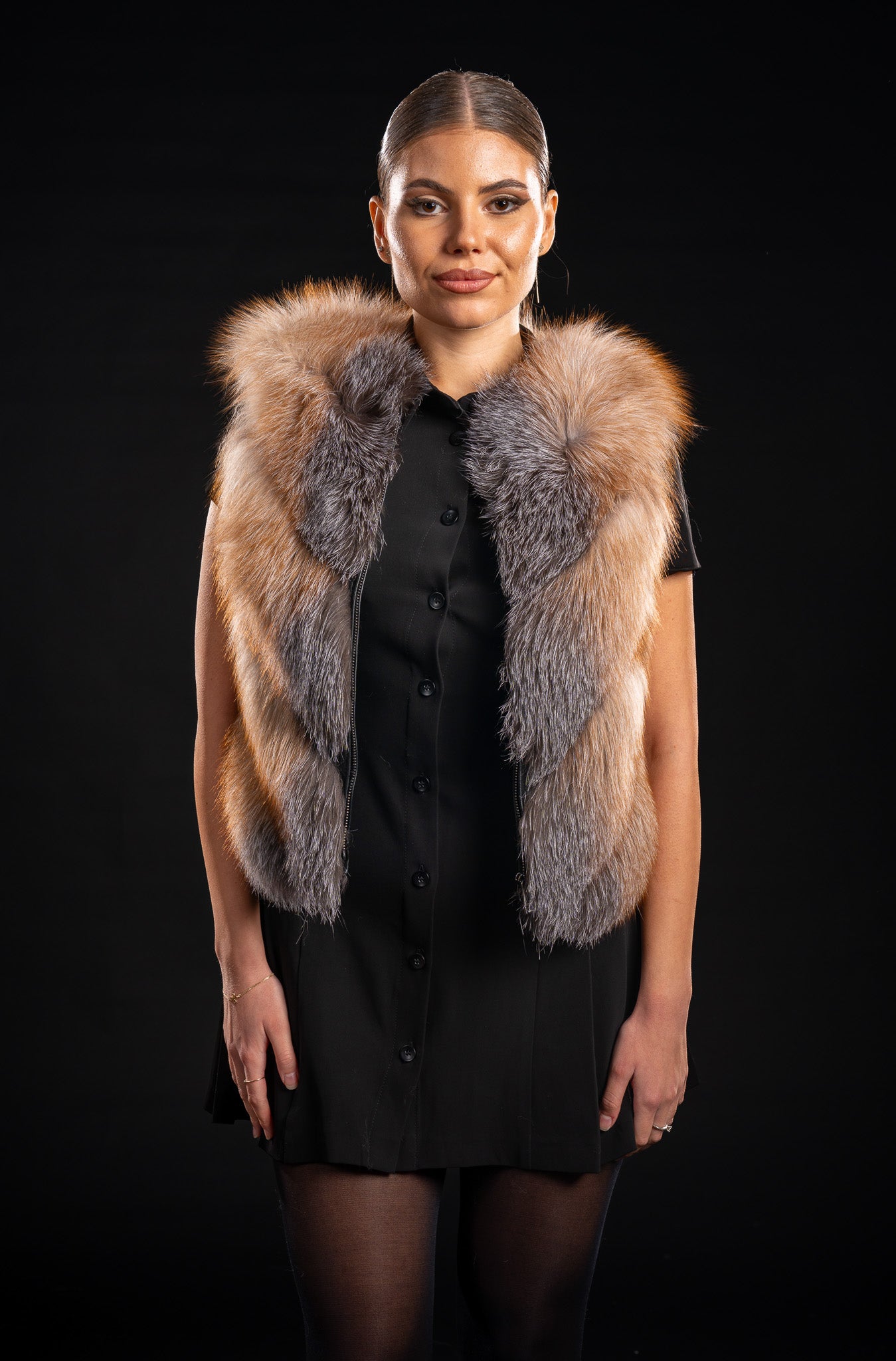 Eleganță și versatilitate într-o singură piesă: modelul în V din blană naturală de vulpe canadiană, se transformă cu ușurință într-o vestă sofisticată prin detașarea mânecilor. Designul blănii, cu bucăți așezate în formă de V, creează un efect vizual de subțiere a siluetei, conferind un look armonios și elegant.