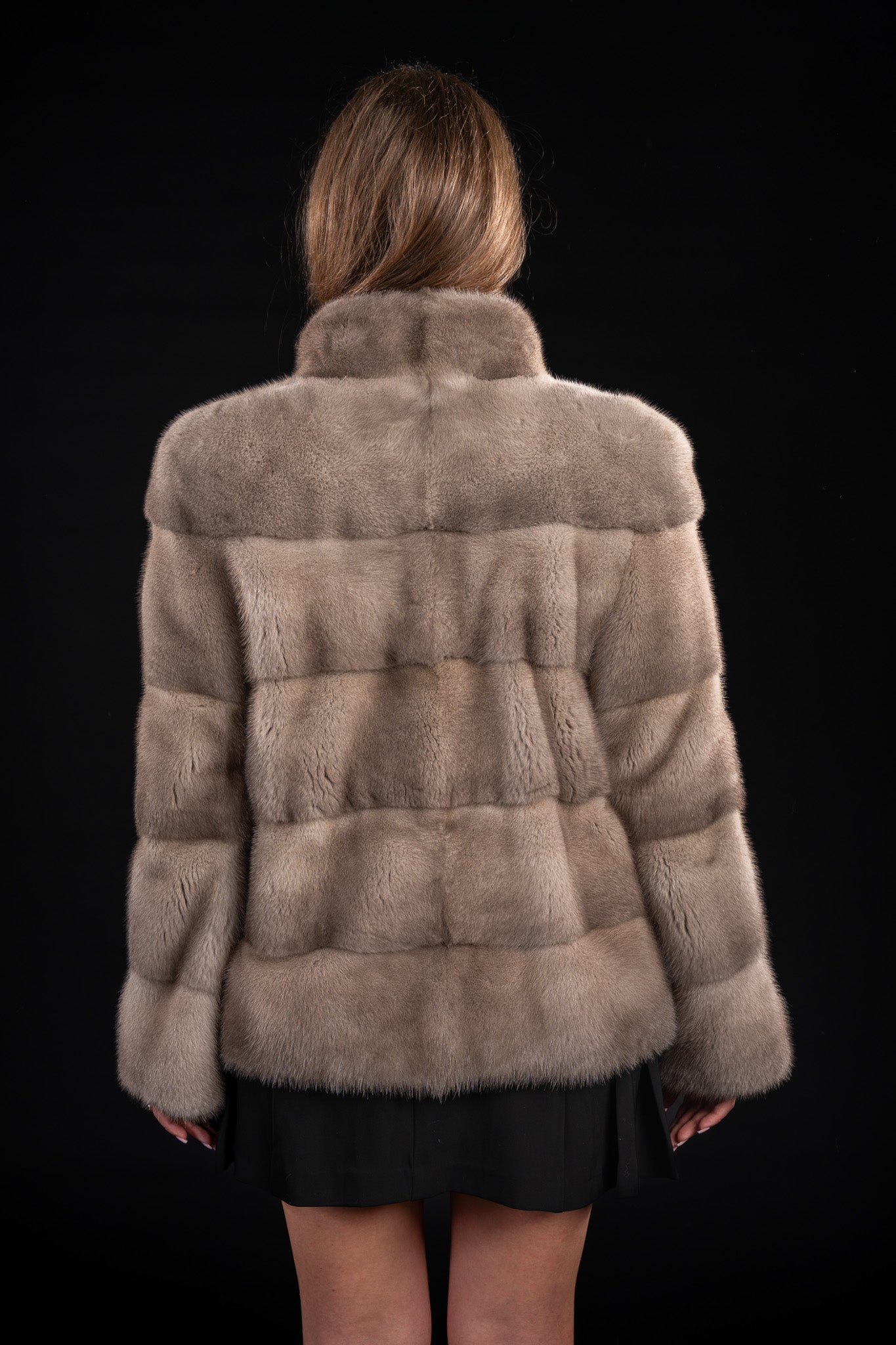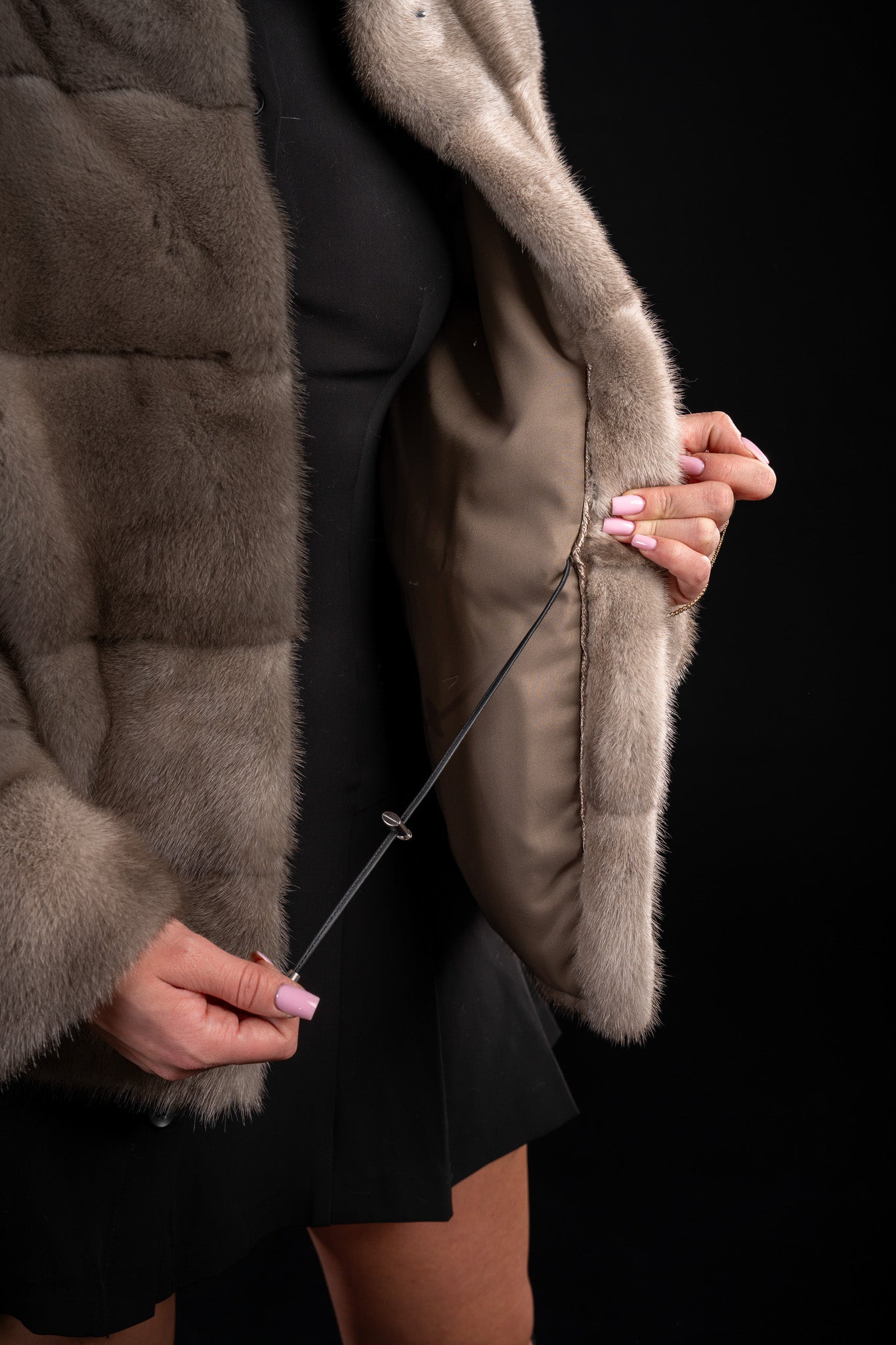 Răsfață-te cu eleganța unei haine din blană naturală de vizon, într-o rafinată nuanță silver-blue, ce emană lux și distincție. Confecționată cu măiestrie din blană de cea mai înaltă calitate, această piesă impresionează prin finețea texturii și strălucirea naturală a culorii.