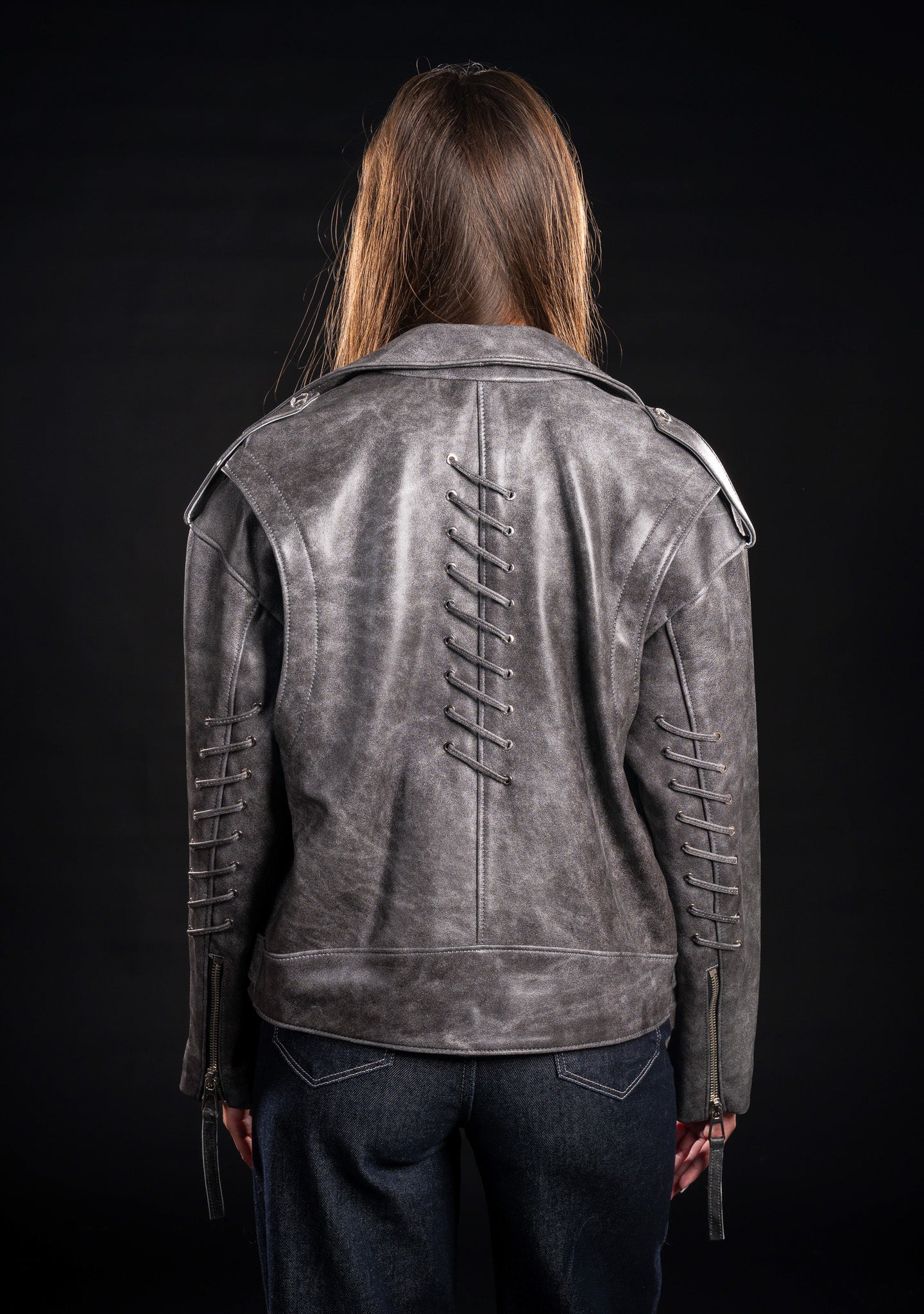 Acestă jachetă din piele naturală îmbină perfect forța și feminitatea, fiind o piesă statement în orice garderobă. Designul modern se remarcă prin împletiturile șnururilor de pe mâneci si spate.
