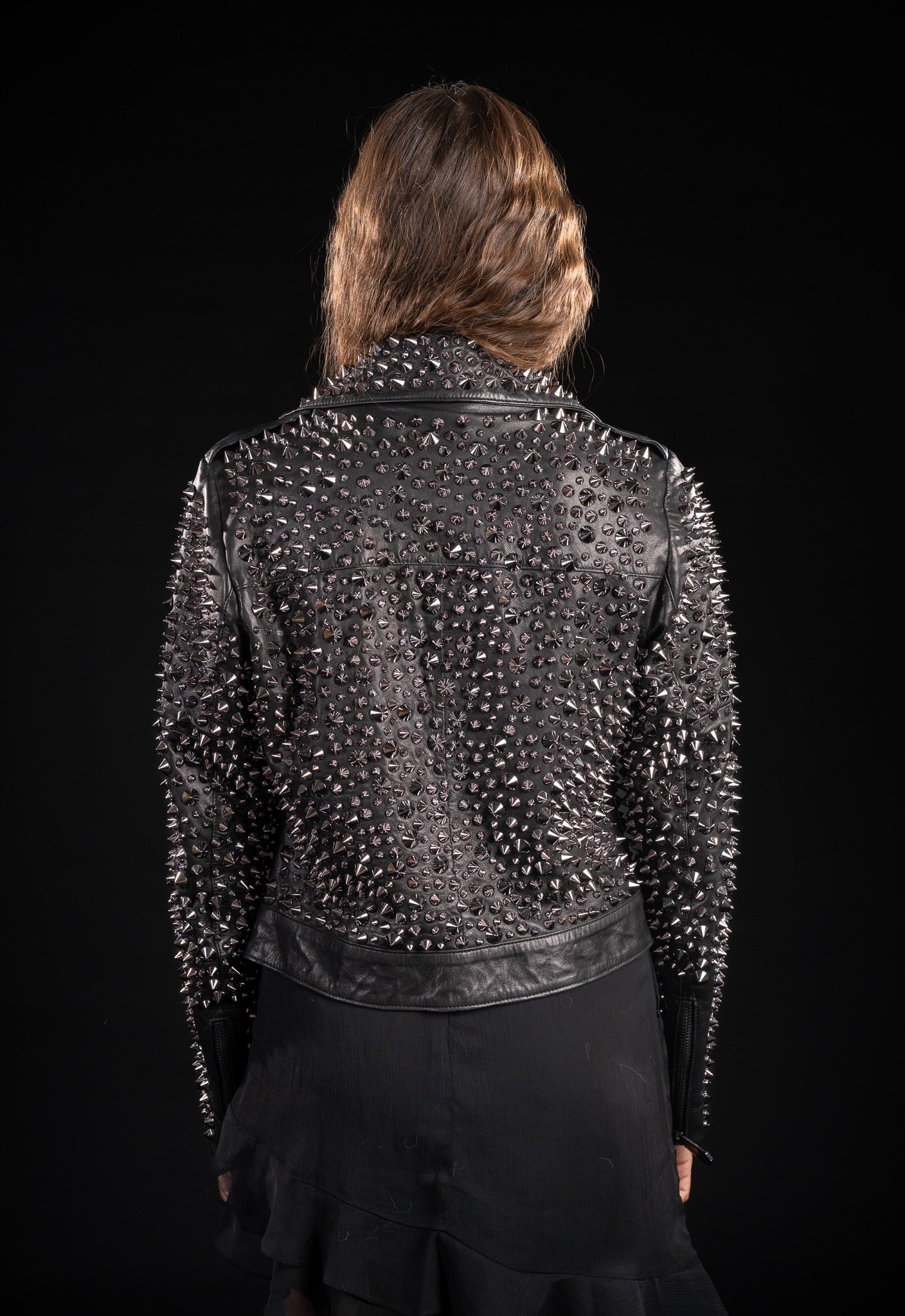 Adaugă un plus de atitudine și rafinament ținutelor tale cu această geacă scurtă din piele naturală, o piesă statement ce emană stil și încredere. Designul este accentuat de ținte negre aplicate meticulos, conferind gecii un aer glam-rock sofisticat.