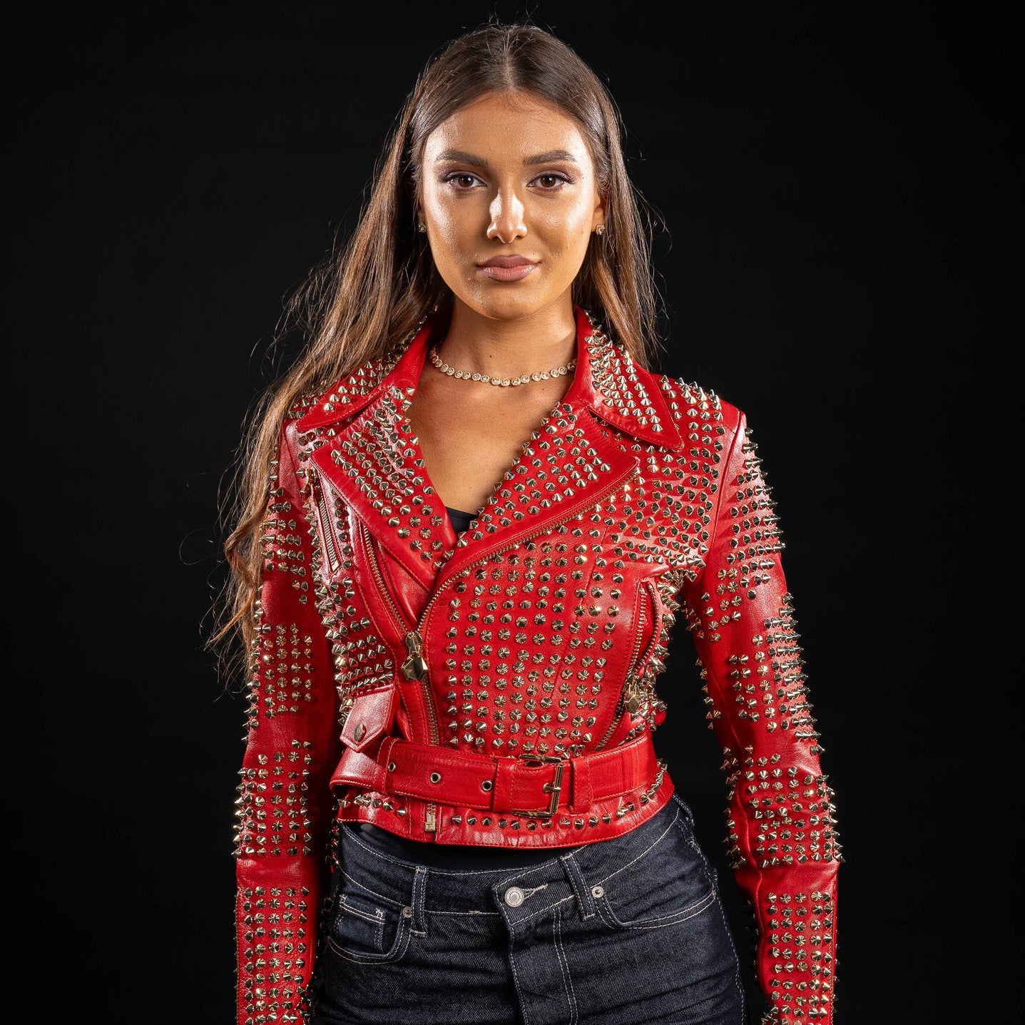 Adaugă un plus de atitudine și rafinament ținutelor tale cu această geacă scurtă din piele naturală roșie, o piesă statement ce emană stil și încredere. Designul este accentuat de ținte aurii aplicate meticulos, care creează un contrast spectaculos cu nuanța intensă de roșu, conferind gecii un aer glam-rock sofisticat.