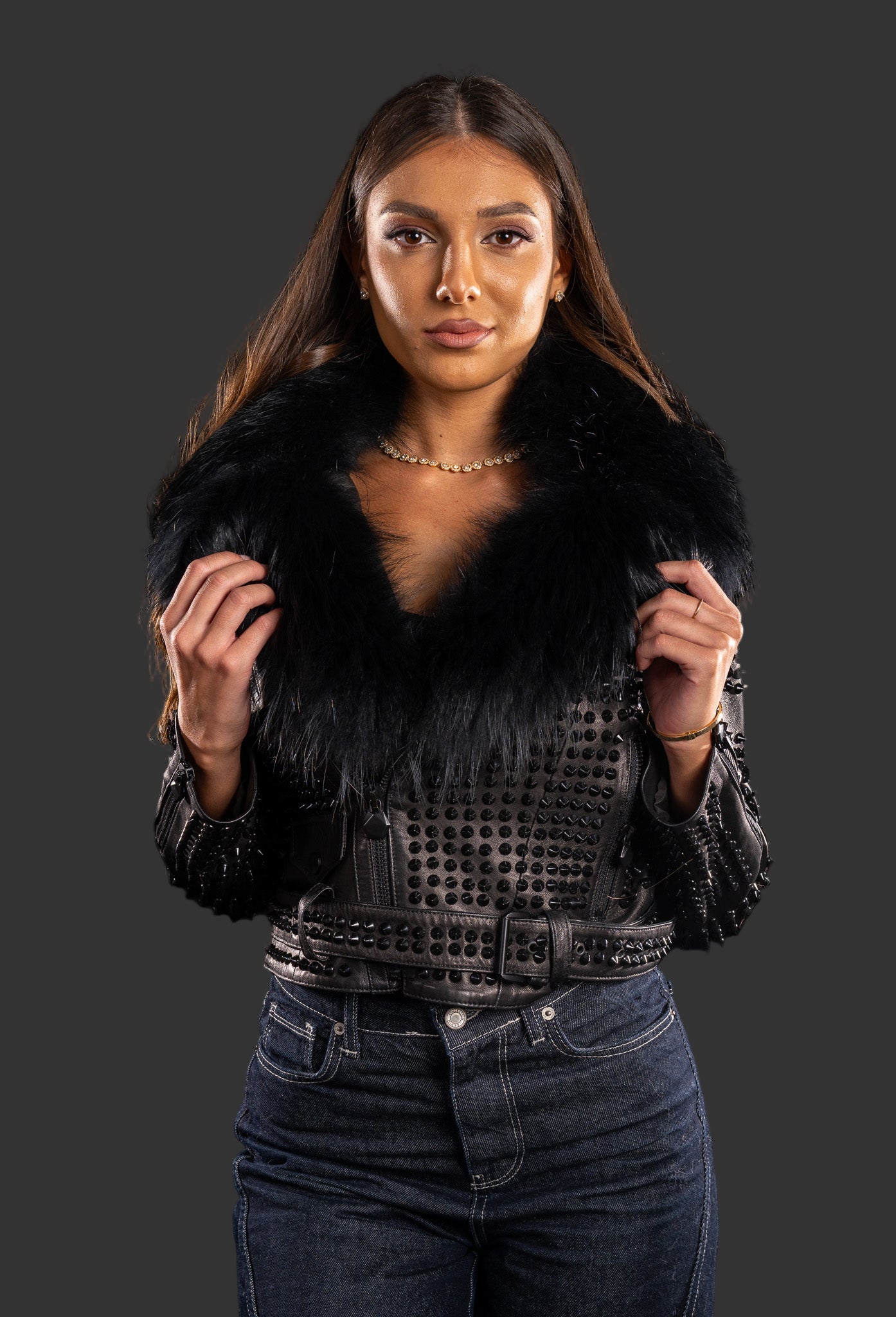Adaugă un plus de atitudine și rafinament ținutelor tale cu această geacă scurtă din piele naturală neagră, o piesă statement ce emană stil și încredere. Designul este accentuat de ținte negre aplicate meticulos, care creează un contrast spectaculos cu nuanța intensă de roșu, conferind gecii un aer glam-rock sofisticat. Gulerul din blana naturală de vulpe argintie este detașabil.