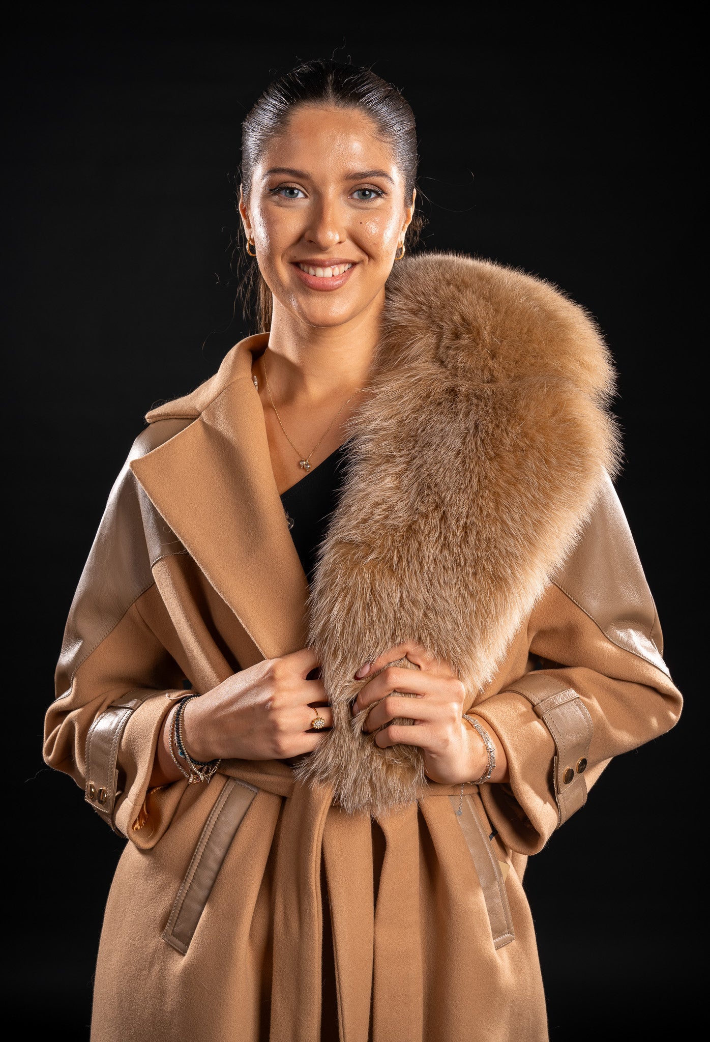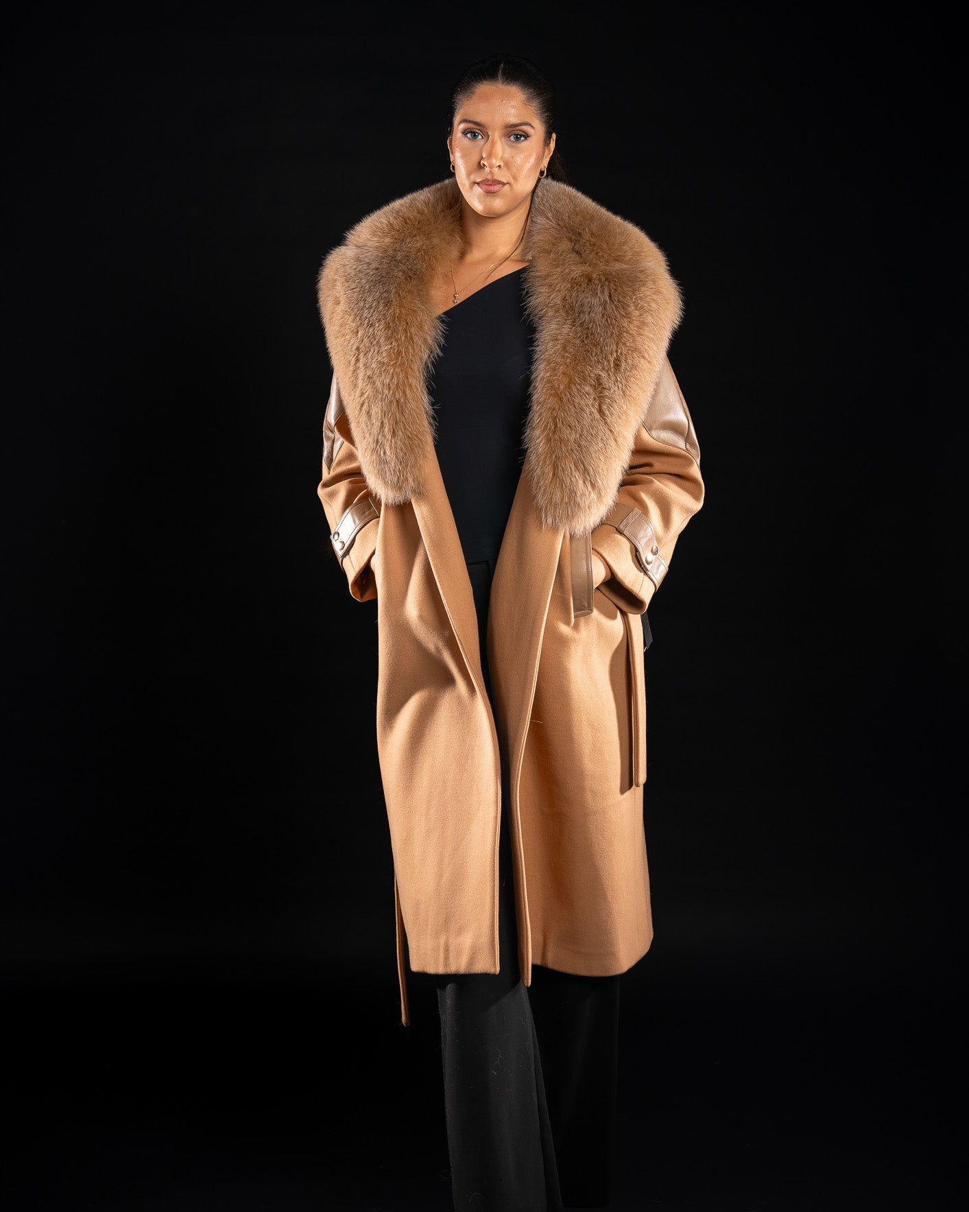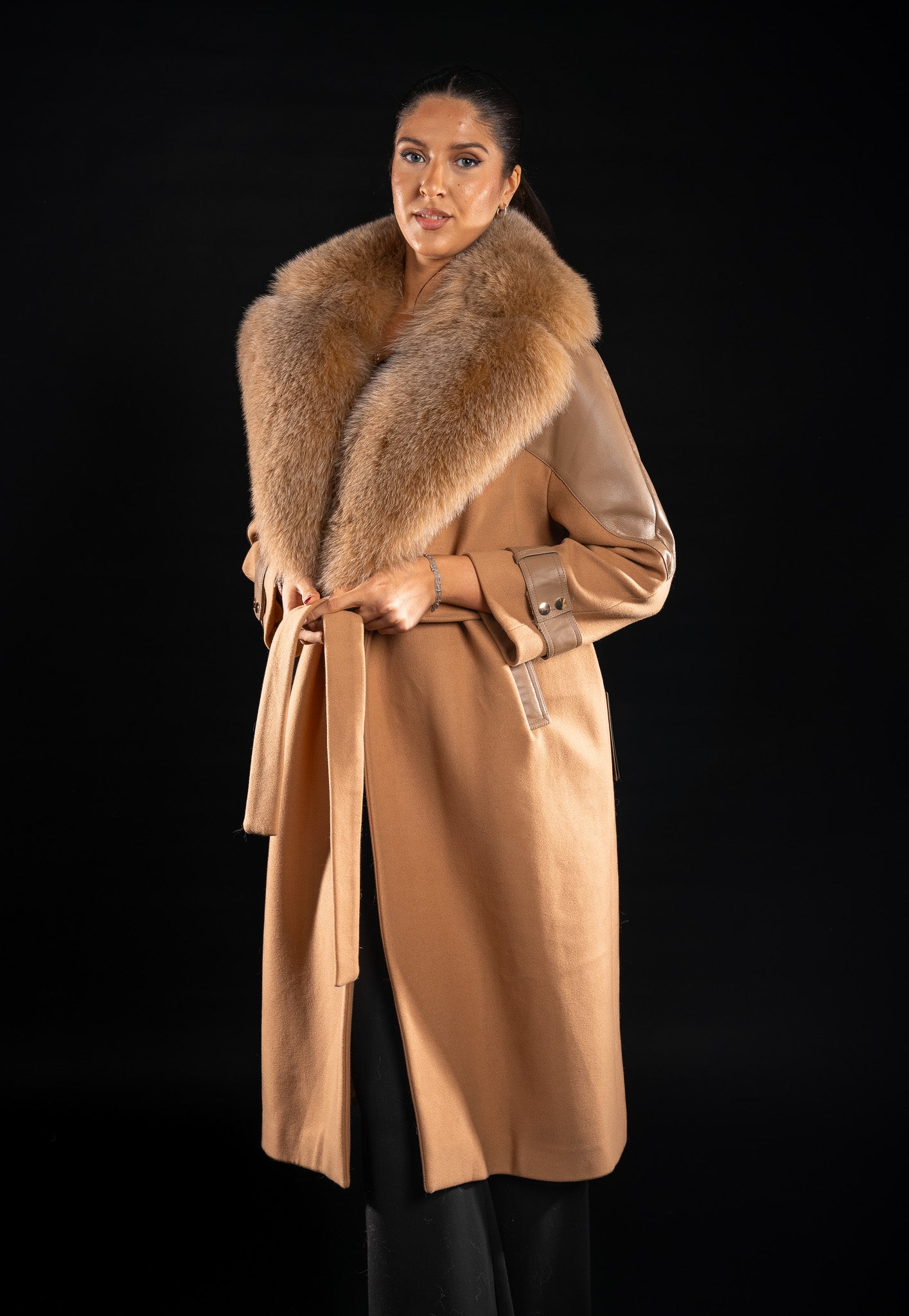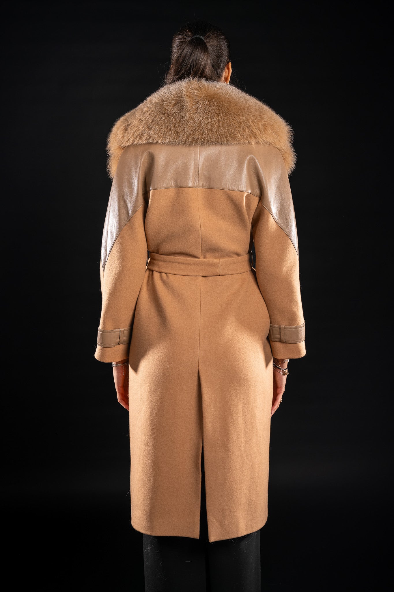 Acest palton rafinat, confecționat din cașmir de cea mai bună calitate, impresionează prin finețea materialului și croiala impecabilă. Gulerul din blană naturală de vulpe polară, în nuanța camel, este detașabil, oferind versatilitate: purtat cu gulerul bogat pentru un look sofisticat sau simplu, cu rever și cordon în talie, pentru un stil elegant și minimalist.