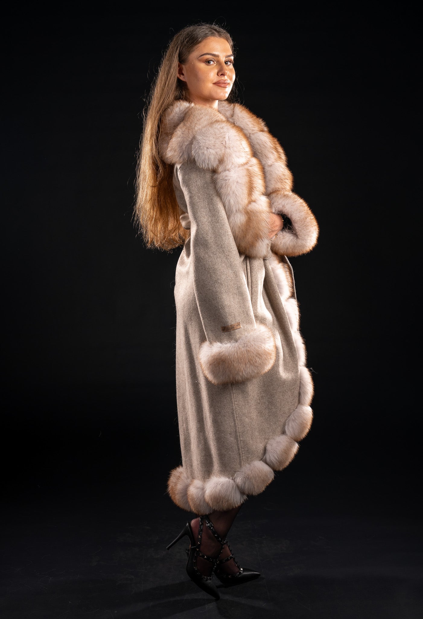 Acest palton spectaculos, realizat din lana de alpaca de cea mai înaltă calitate, îmbină eleganța clasică cu rafinamentul detaliilor de lux. Nuanța delicată light sable a vulpii subliniază finețea materialului și oferă o notă sofisticată, perfectă pentru sezonul rece.