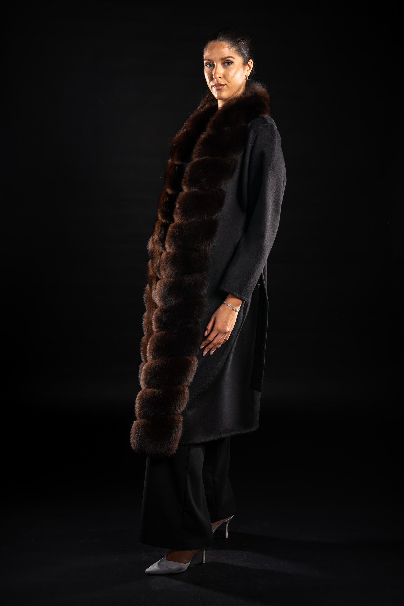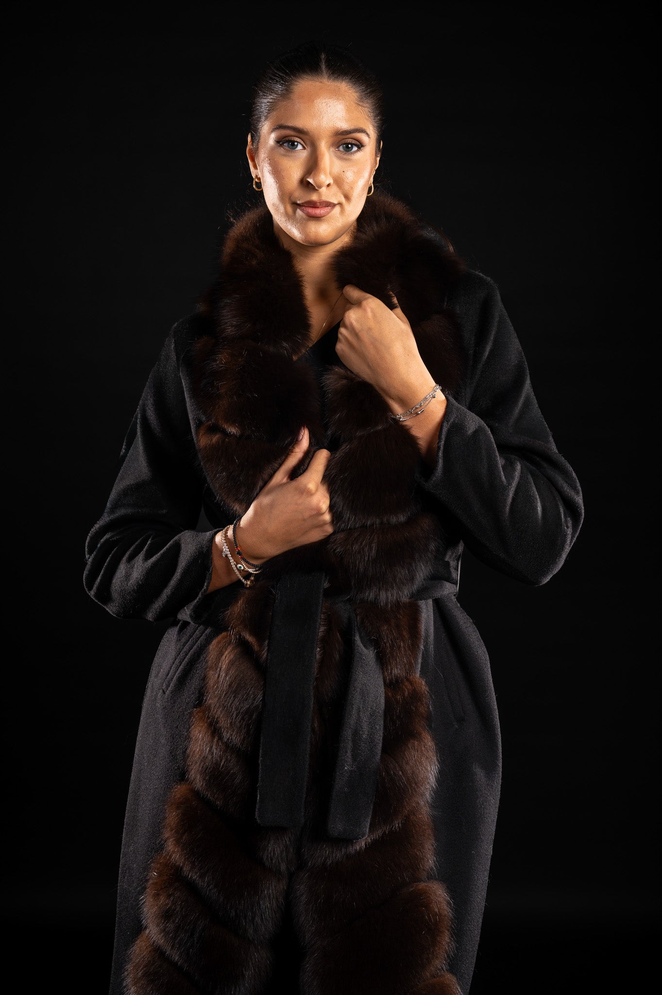 Gulerul înalt se ridică până la baza, fiind complet acoperit de blana naturală de vulpe polara in nuanță de Black Sable, oferind un plus de căldură și lux.